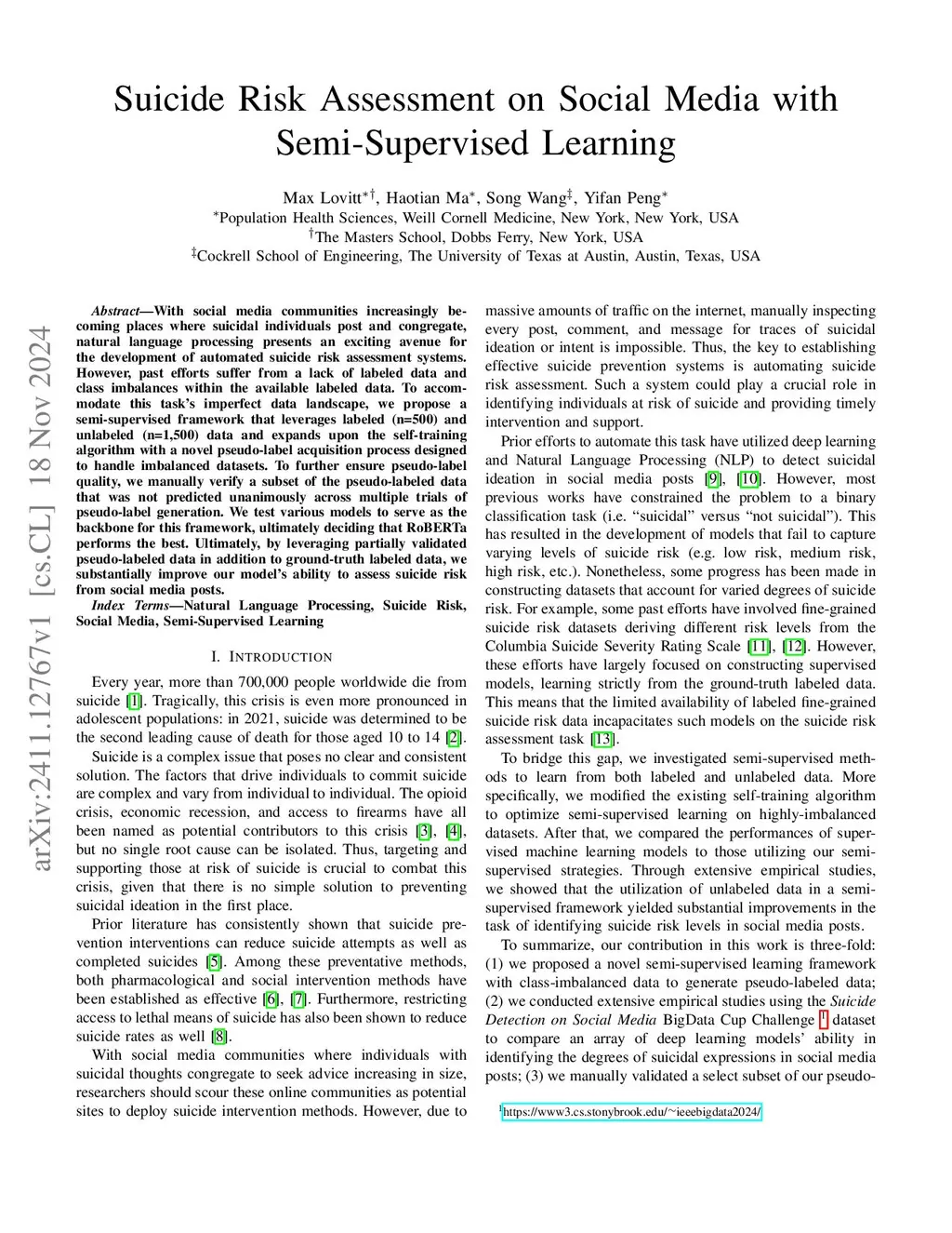 Suicide Risk Assessment on Social Media with Semi-Supervised Learning