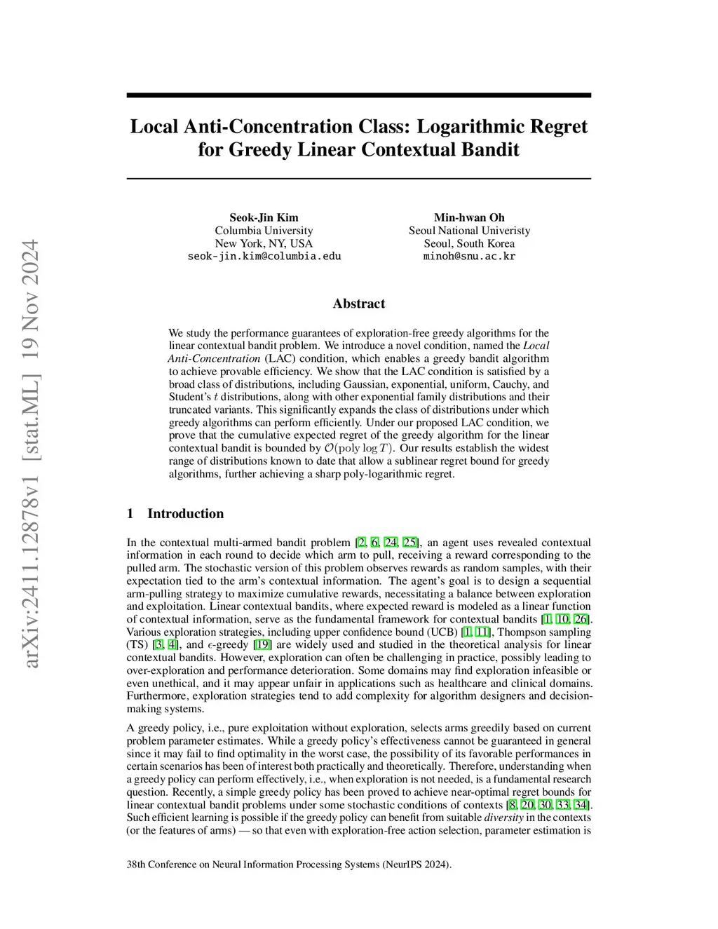 We study the performance guarantees of exploration-free greedy algorithms for the linear contextual bandit problem. We introduce a novel condition, named the \textit{Local Anti-Concentration} (LAC) condition, which enables a greedy bandit algorithm to achieve provable efficiency. We show that the LAC condition is satisfied by a broad class of distributions, including Gaussian, exponential, uniform, Cauchy, and Student's~ distributions, along with other exponential family distributions and their truncated variants. This significantly expands the class of distributions under which greedy algorithms can perform efficiently. Under our proposed LAC condition, we prove that the cumulative expected regret of the greedy algorithm for the linear contextual bandit is bounded by . Our results establish the widest range of distributions known to date that allow a sublinear regret bound for greedy algorithms, further achieving a sharp poly-logarithmic regret.