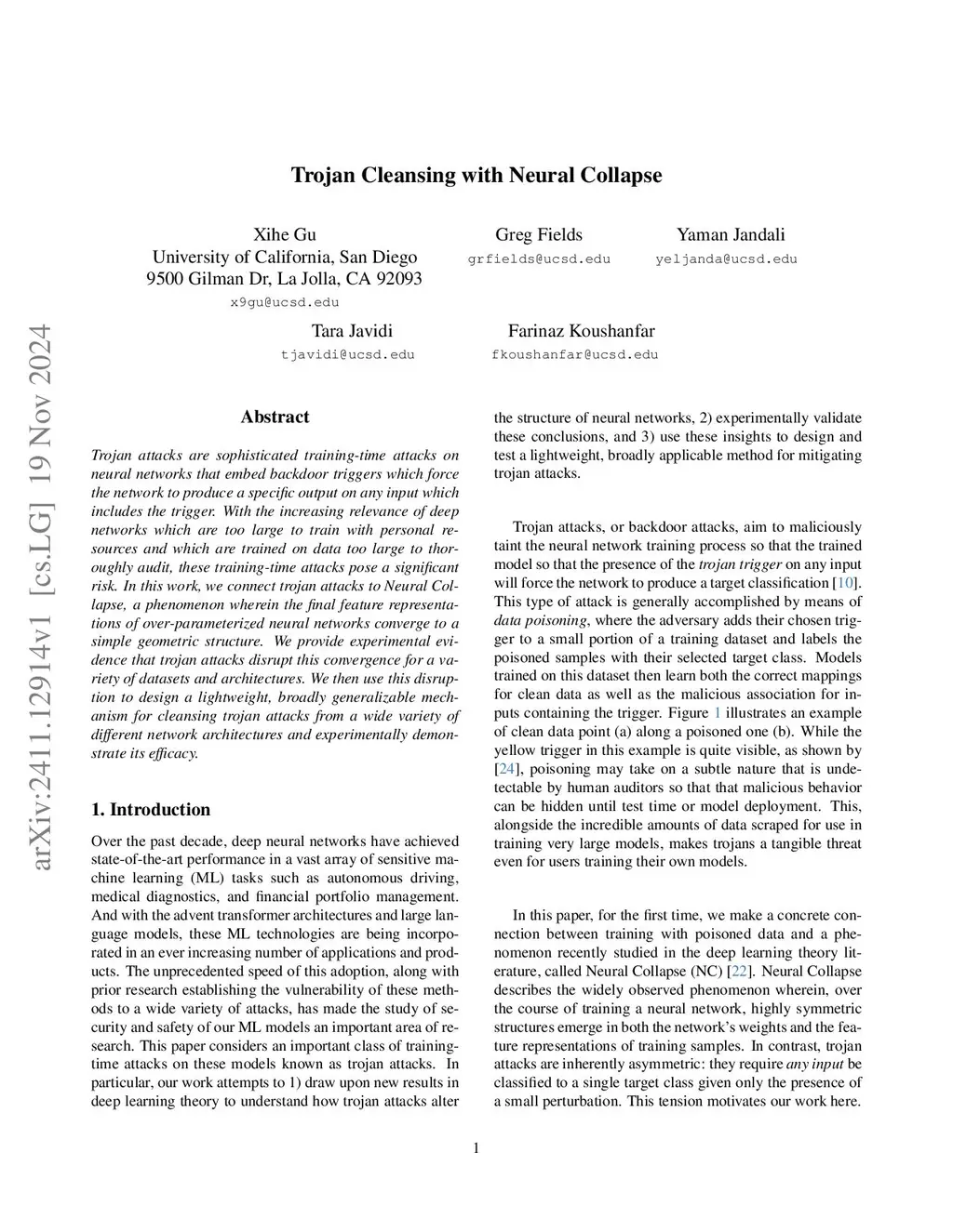 Trojan attacks are sophisticated training-time attacks on neural networks that embed backdoor triggers which force the network to produce a specific output on any input which includes the trigger. With the increasing relevance of deep networks which are too large to train with personal resources and which are trained on data too large to thoroughly audit, these training-time attacks pose a significant risk. In this work, we connect trojan attacks to Neural Collapse, a phenomenon wherein the final feature representations of over-parameterized neural networks converge to a simple geometric structure. We provide experimental evidence that trojan attacks disrupt this convergence for a variety of datasets and architectures. We then use this disruption to design a lightweight, broadly generalizable mechanism for cleansing trojan attacks from a wide variety of different network architectures and experimentally demonstrate its efficacy.