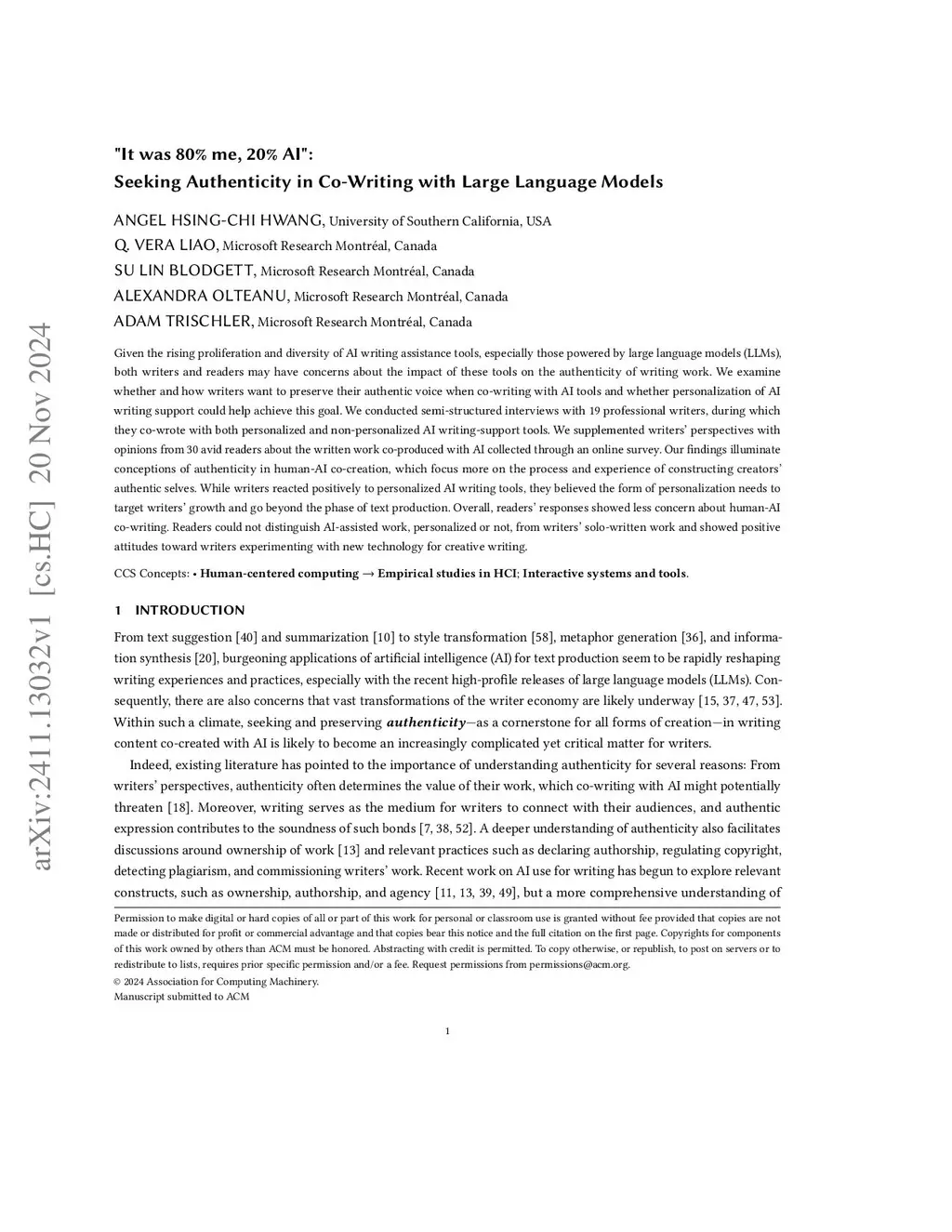 "It was 80% me, 20% AI": Seeking Authenticity in Co-Writing with Large