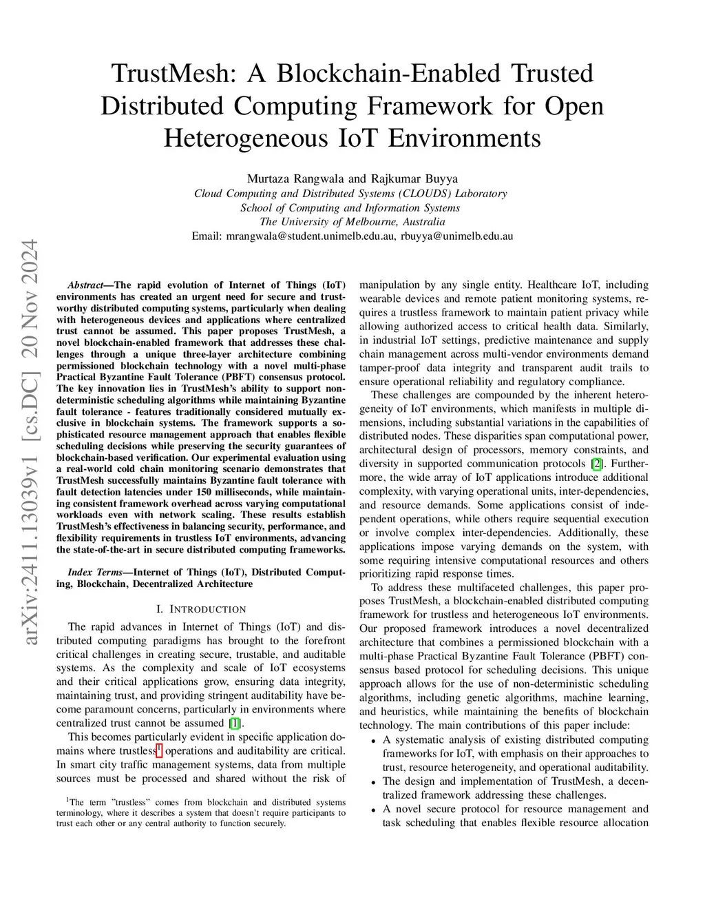 The rapid evolution of Internet of Things (IoT) environments has created an urgent need for secure and trustworthy distributed computing systems, particularly when dealing with heterogeneous devices and applications where centralized trust cannot be assumed. This paper proposes TrustMesh, a novel blockchain-enabled framework that addresses these challenges through a unique three-layer architecture combining permissioned blockchain technology with a novel multi-phase Practical Byzantine Fault Tolerance (PBFT) consensus protocol. The key innovation lies in TrustMesh's ability to support non-deterministic scheduling algorithms while maintaining Byzantine fault tolerance - features traditionally considered mutually exclusive in blockchain systems. The framework supports a sophisticated resource management approach that enables flexible scheduling decisions while preserving the security guarantees of blockchain-based verification. Our experimental evaluation using a real-world cold chain monitoring scenario demonstrates that TrustMesh successfully maintains Byzantine fault tolerance with fault detection latencies under 150 milliseconds, while maintaining consistent framework overhead across varying computational workloads even with network scaling. These results establish TrustMesh's effectiveness in balancing security, performance, and flexibility requirements in trustless IoT environments, advancing the state-of-the-art in secure distributed computing frameworks.