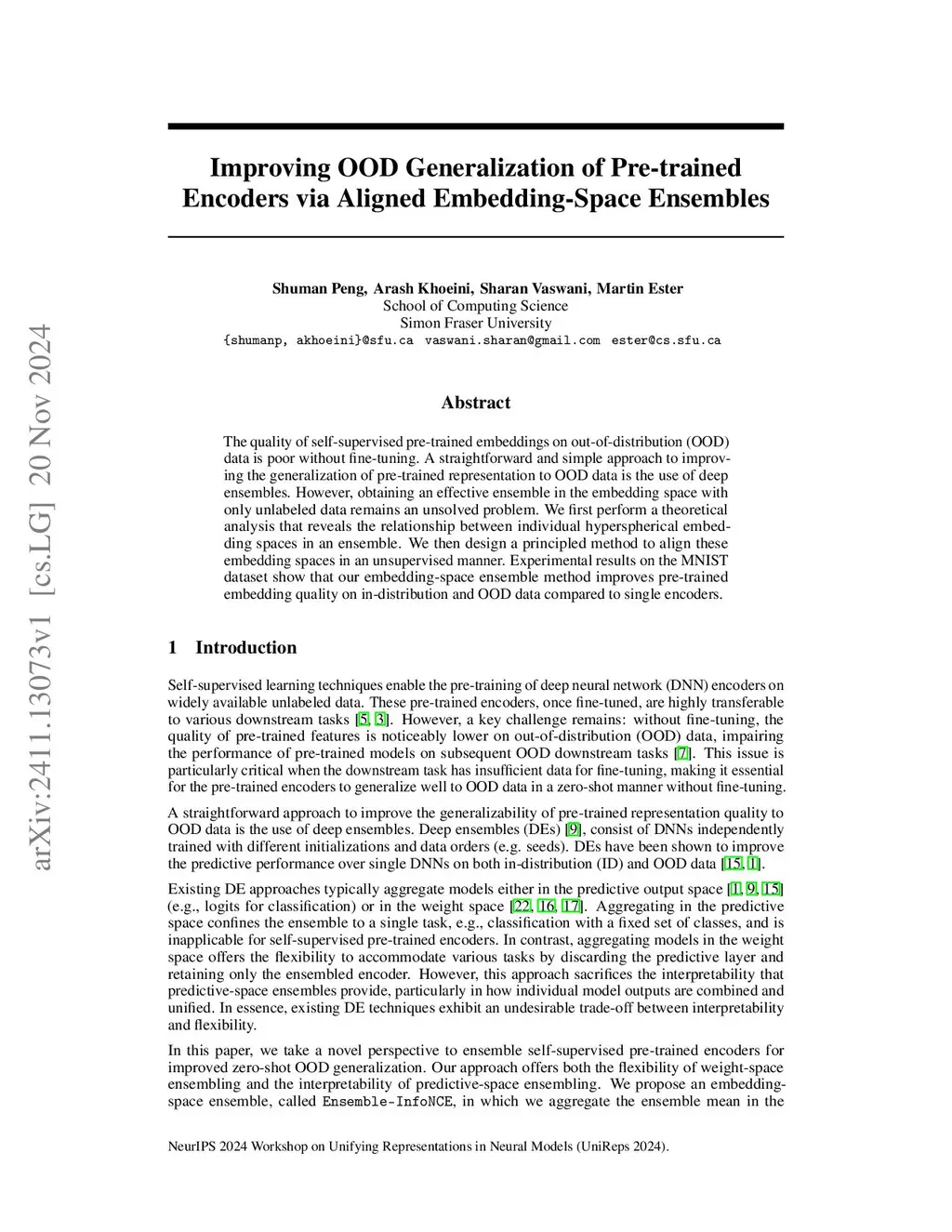 The quality of self-supervised pre-trained embeddings on out-of-distribution (OOD) data is poor without fine-tuning. A straightforward and simple approach to improving the generalization of pre-trained representation to OOD data is the use of deep ensembles. However, obtaining an effective ensemble in the embedding space with only unlabeled data remains an unsolved problem. We first perform a theoretical analysis that reveals the relationship between individual hyperspherical embedding spaces in an ensemble. We then design a principled method to align these embedding spaces in an unsupervised manner. Experimental results on the MNIST dataset show that our embedding-space ensemble method improves pre-trained embedding quality on in-distribution and OOD data compared to single encoders.