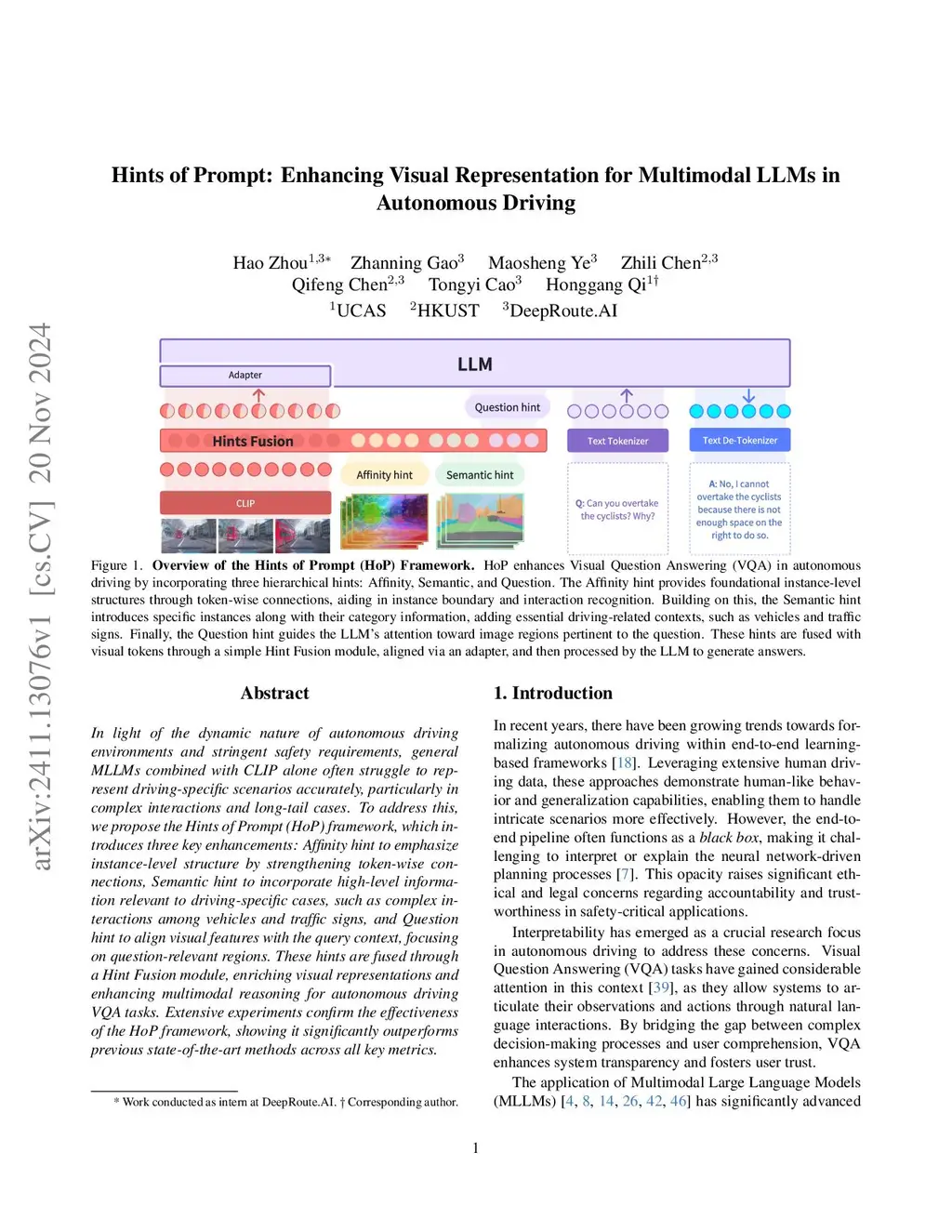 In light of the dynamic nature of autonomous driving environments and stringent safety requirements, general MLLMs combined with CLIP alone often struggle to accurately represent driving-specific scenarios, particularly in complex interactions and long-tail cases. To address this, we propose the Hints of Prompt (HoP) framework, which introduces three key enhancements: Affinity hint to emphasize instance-level structure by strengthening token-wise connections, Semantic hint to incorporate high-level information relevant to driving-specific cases, such as complex interactions among vehicles and traffic signs, and Question hint to align visual features with the query context, focusing on question-relevant regions. These hints are fused through a Hint Fusion module, enriching visual representations by capturing driving-related representations with limited domain data, ensuring faster adaptation to driving scenarios. Extensive experiments confirm the effectiveness of the HoP framework, showing that it significantly outperforms previous state-of-the-art methods in all key metrics.