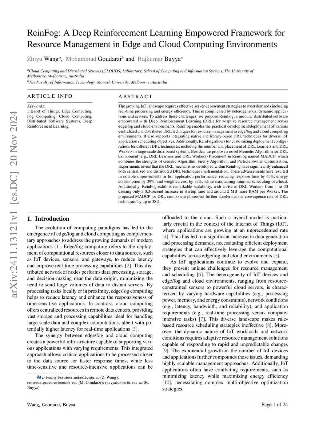 The growing IoT landscape requires effective server deployment strategies to meet demands including real-time processing and energy efficiency. This is complicated by heterogeneous, dynamic applications and servers. To address these challenges, we propose ReinFog, a modular distributed software empowered with Deep Reinforcement Learning (DRL) for adaptive resource management across edge/fog and cloud environments. ReinFog enables the practical development/deployment of various centralized and distributed DRL techniques for resource management in edge/fog and cloud computing environments. It also supports integrating native and library-based DRL techniques for diverse IoT application scheduling objectives. Additionally, ReinFog allows for customizing deployment configurations for different DRL techniques, including the number and placement of DRL Learners and DRL Workers in large-scale distributed systems. Besides, we propose a novel Memetic Algorithm for DRL Component (e.g., DRL Learners and DRL Workers) Placement in ReinFog named MADCP, which combines the strengths of Genetic Algorithm, Firefly Algorithm, and Particle Swarm Optimization. Experiments reveal that the DRL mechanisms developed within ReinFog have significantly enhanced both centralized and distributed DRL techniques implementation. These advancements have resulted in notable improvements in IoT application performance, reducing response time by 45%, energy consumption by 39%, and weighted cost by 37%, while maintaining minimal scheduling overhead. Additionally, ReinFog exhibits remarkable scalability, with a rise in DRL Workers from 1 to 30 causing only a 0.3-second increase in startup time and around 2 MB more RAM per Worker. The proposed MADCP for DRL component placement further accelerates the convergence rate of DRL techniques by up to 38%.