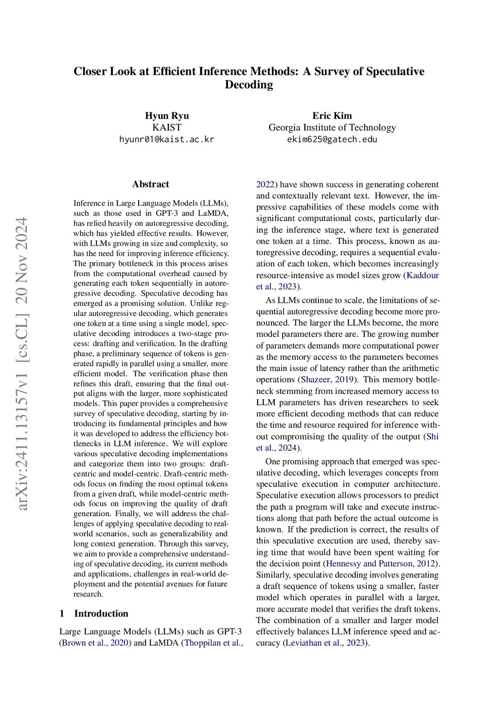 Efficient inference in large language models (LLMs) has become a critical focus as their scale and complexity grow. Traditional autoregressive decoding, while effective, suffers from computational inefficiencies due to its sequential token generation process. Speculative decoding addresses this bottleneck by introducing a two-stage framework: drafting and verification. A smaller, efficient model generates a preliminary draft, which is then refined by a larger, more sophisticated model. This paper provides a comprehensive survey of speculative decoding methods, categorizing them into draft-centric and model-centric approaches. We discuss key ideas associated with each method, highlighting their potential for scaling LLM inference. This survey aims to guide future research in optimizing speculative decoding and its integration into real-world LLM applications.