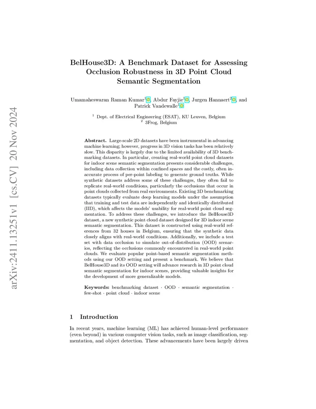 Large-scale 2D datasets have been instrumental in advancing machine learning; however, progress in 3D vision tasks has been relatively slow. This disparity is largely due to the limited availability of 3D benchmarking datasets. In particular, creating real-world point cloud datasets for indoor scene semantic segmentation presents considerable challenges, including data collection within confined spaces and the costly, often inaccurate process of per-point labeling to generate ground truths. While synthetic datasets address some of these challenges, they often fail to replicate real-world conditions, particularly the occlusions that occur in point clouds collected from real environments. Existing 3D benchmarking datasets typically evaluate deep learning models under the assumption that training and test data are independently and identically distributed (IID), which affects the models' usability for real-world point cloud segmentation. To address these challenges, we introduce the BelHouse3D dataset, a new synthetic point cloud dataset designed for 3D indoor scene semantic segmentation. This dataset is constructed using real-world references from 32 houses in Belgium, ensuring that the synthetic data closely aligns with real-world conditions. Additionally, we include a test set with data occlusion to simulate out-of-distribution (OOD) scenarios, reflecting the occlusions commonly encountered in real-world point clouds. We evaluate popular point-based semantic segmentation methods using our OOD setting and present a benchmark. We believe that BelHouse3D and its OOD setting will advance research in 3D point cloud semantic segmentation for indoor scenes, providing valuable insights for the development of more generalizable models.