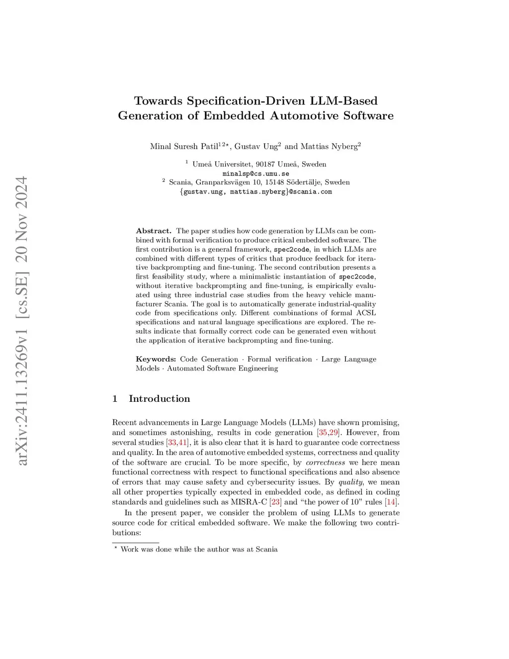 The paper studies how code generation by LLMs can be combined with formal verification to produce critical embedded software. The first contribution is a general framework, spec2code, in which LLMs are combined with different types of critics that produce feedback for iterative backprompting and fine-tuning. The second contribution presents a first feasibility study, where a minimalistic instantiation of spec2code, without iterative backprompting and fine-tuning, is empirically evaluated using three industrial case studies from the heavy vehicle manufacturer Scania. The goal is to automatically generate industrial-quality code from specifications only. Different combinations of formal ACSL specifications and natural language specifications are explored. The results indicate that formally correct code can be generated even without the application of iterative backprompting and fine-tuning.