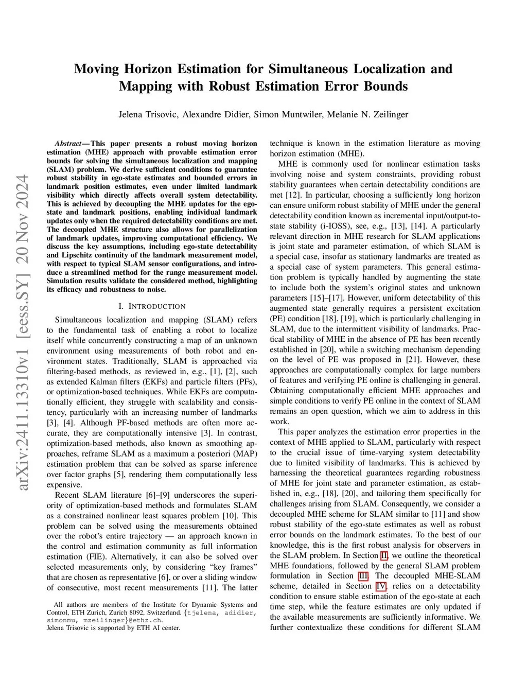 This paper presents a robust moving horizon estimation (MHE) approach with provable estimation error bounds for solving the simultaneous localization and mapping (SLAM) problem. We derive sufficient conditions to guarantee robust stability in ego-state estimates and bounded errors in landmark position estimates, even under limited landmark visibility which directly affects overall system detectability. This is achieved by decoupling the MHE updates for the ego-state and landmark positions, enabling individual landmark updates only when the required detectability conditions are met. The decoupled MHE structure also allows for parallelization of landmark updates, improving computational efficiency. We discuss the key assumptions, including ego-state detectability and Lipschitz continuity of the landmark measurement model, with respect to typical SLAM sensor configurations, and introduce a streamlined method for the range measurement model. Simulation results validate the considered method, highlighting its efficacy and robustness to noise.