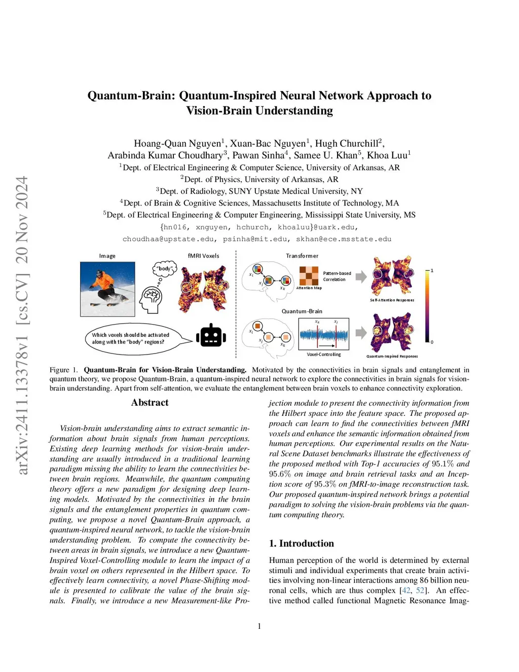 Vision-brain understanding aims to extract semantic information about brain signals from human perceptions. Existing deep learning methods for vision-brain understanding are usually introduced in a traditional learning paradigm missing the ability to learn the connectivities between brain regions. Meanwhile, the quantum computing theory offers a new paradigm for designing deep learning models. Motivated by the connectivities in the brain signals and the entanglement properties in quantum computing, we propose a novel Quantum-Brain approach, a quantum-inspired neural network, to tackle the vision-brain understanding problem. To compute the connectivity between areas in brain signals, we introduce a new Quantum-Inspired Voxel-Controlling module to learn the impact of a brain voxel on others represented in the Hilbert space. To effectively learn connectivity, a novel Phase-Shifting module is presented to calibrate the value of the brain signals. Finally, we introduce a new Measurement-like Projection module to present the connectivity information from the Hilbert space into the feature space. The proposed approach can learn to find the connectivities between fMRI voxels and enhance the semantic information obtained from human perceptions. Our experimental results on the Natural Scene Dataset benchmarks illustrate the effectiveness of the proposed method with Top-1 accuracies of 95.1% and 95.6% on image and brain retrieval tasks and an Inception score of 95.3% on fMRI-to-image reconstruction task. Our proposed quantum-inspired network brings a potential paradigm to solving the vision-brain problems via the quantum computing theory.