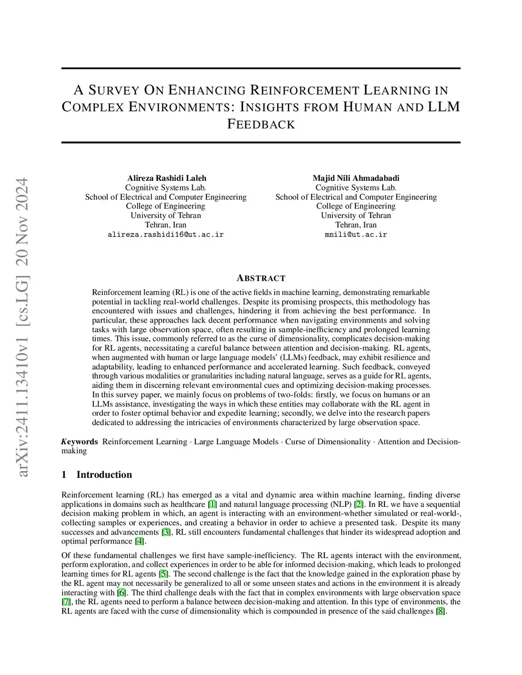 Reinforcement learning (RL) is one of the active fields in machine learning, demonstrating remarkable potential in tackling real-world challenges. Despite its promising prospects, this methodology has encountered with issues and challenges, hindering it from achieving the best performance. In particular, these approaches lack decent performance when navigating environments and solving tasks with large observation space, often resulting in sample-inefficiency and prolonged learning times. This issue, commonly referred to as the curse of dimensionality, complicates decision-making for RL agents, necessitating a careful balance between attention and decision-making. RL agents, when augmented with human or large language models' (LLMs) feedback, may exhibit resilience and adaptability, leading to enhanced performance and accelerated learning. Such feedback, conveyed through various modalities or granularities including natural language, serves as a guide for RL agents, aiding them in discerning relevant environmental cues and optimizing decision-making processes. In this survey paper, we mainly focus on problems of two-folds: firstly, we focus on humans or an LLMs assistance, investigating the ways in which these entities may collaborate with the RL agent in order to foster optimal behavior and expedite learning; secondly, we delve into the research papers dedicated to addressing the intricacies of environments characterized by large observation space.