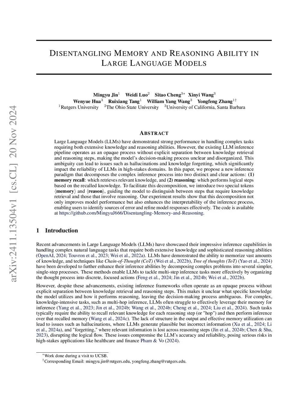 Disentangling Memory and Reasoning Ability in Large Language Models