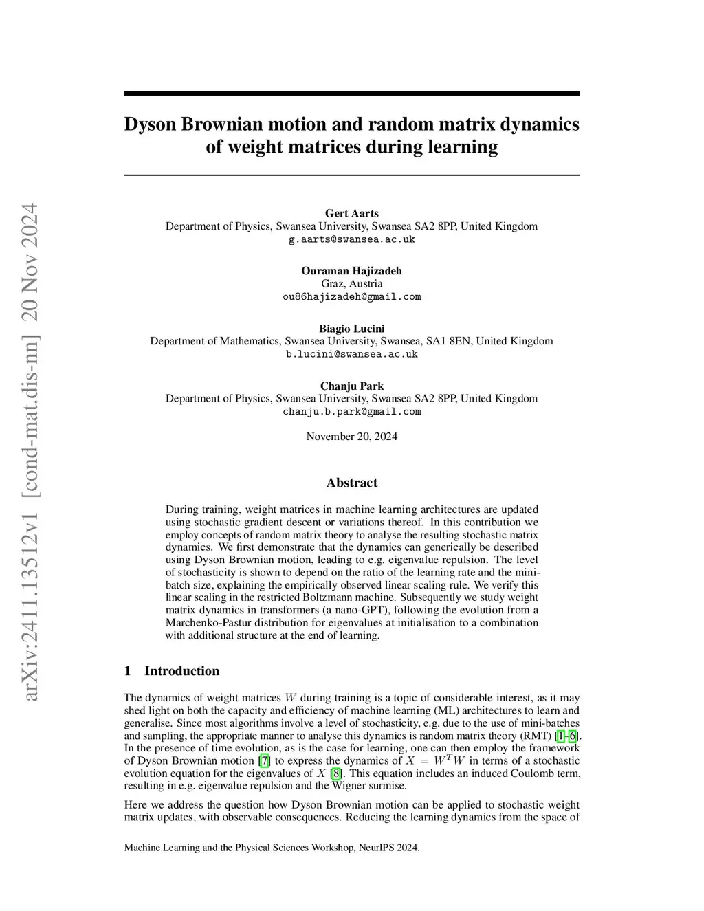 During training, weight matrices in machine learning architectures are updated using stochastic gradient descent or variations thereof. In this contribution we employ concepts of random matrix theory to analyse the resulting stochastic matrix dynamics. We first demonstrate that the dynamics can generically be described using Dyson Brownian motion, leading to e.g. eigenvalue repulsion. The level of stochasticity is shown to depend on the ratio of the learning rate and the mini-batch size, explaining the empirically observed linear scaling rule. We verify this linear scaling in the restricted Boltzmann machine. Subsequently we study weight matrix dynamics in transformers (a nano-GPT), following the evolution from a Marchenko-Pastur distribution for eigenvalues at initialisation to a combination with additional structure at the end of learning.