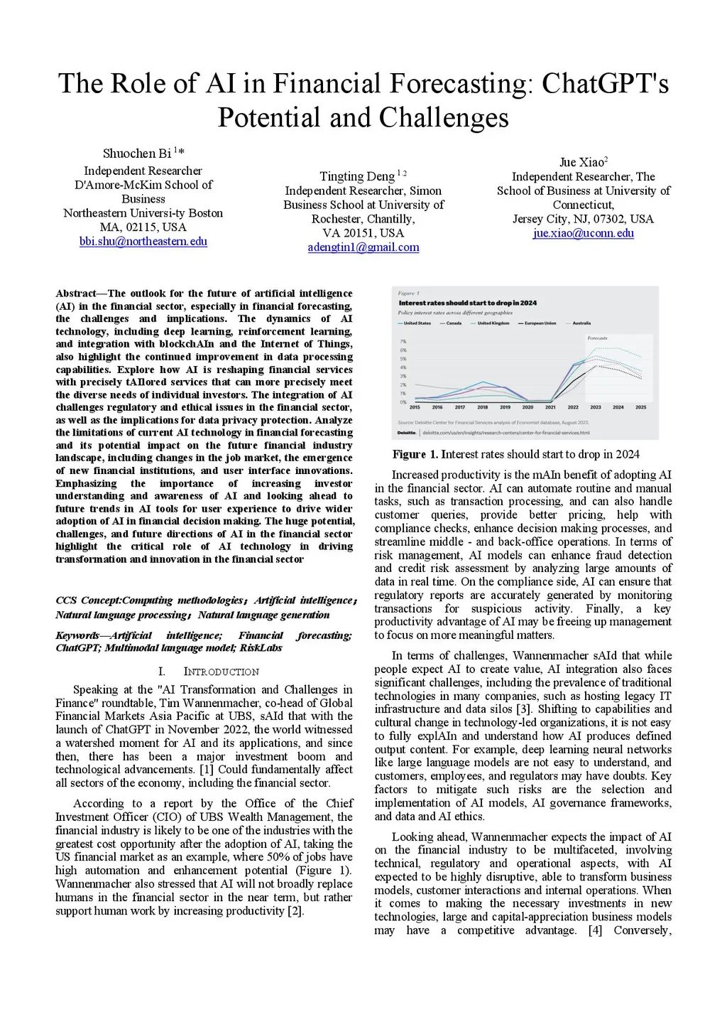 The outlook for the future of artificial intelligence (AI) in the financial sector, especially in financial forecasting, the challenges and implications. The dynamics of AI technology, including deep learning, reinforcement learning, and integration with blockchAIn and the Internet of Things, also highlight the continued improvement in data processing capabilities. Explore how AI is reshaping financial services with precisely tAIlored services that can more precisely meet the diverse needs of individual investors. The integration of AI challenges regulatory and ethical issues in the financial sector, as well as the implications for data privacy protection. Analyze the limitations of current AI technology in financial forecasting and its potential impact on the future financial industry landscape, including changes in the job market, the emergence of new financial institutions, and user interface innovations. Emphasizing the importance of increasing investor understanding and awareness of AI and looking ahead to future trends in AI tools for user experience to drive wider adoption of AI in financial decision making. The huge potential, challenges, and future directions of AI in the financial sector highlight the critical role of AI technology in driving transformation and innovation in the financial sector