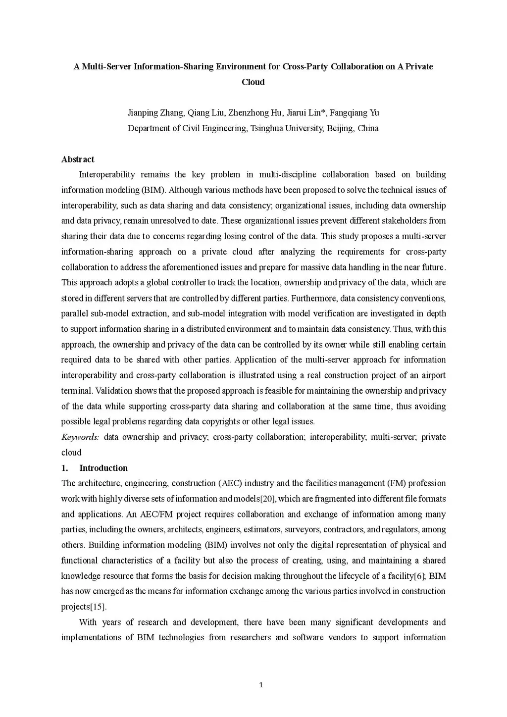 Interoperability remains the key problem in multi-discipline collaboration based on building information modeling (BIM). Although various methods have been proposed to solve the technical issues of interoperability, such as data sharing and data consistency; organizational issues, including data ownership and data privacy, remain unresolved to date. These organizational issues prevent different stakeholders from sharing their data due to concerns regarding losing control of the data. This study proposes a multi-server information-sharing approach on a private cloud after analyzing the requirements for cross-party collaboration to address the aforementioned issues and prepare for massive data handling in the near future. This approach adopts a global controller to track the location, ownership and privacy of the data, which are stored in different servers that are controlled by different parties. Furthermore, data consistency conventions, parallel sub-model extraction, and sub-model integration with model verification are investigated in depth to support information sharing in a distributed environment and to maintain data consistency. Thus, with this approach, the ownership and privacy of the data can be controlled by its owner while still enabling certain required data to be shared with other parties. Application of the multi-server approach for information interoperability and cross-party collaboration is illustrated using a real construction project of an airport terminal. Validation shows that the proposed approach is feasible for maintaining the ownership and privacy of the data while supporting cross-party data sharing and collaboration at the same time, thus avoiding possible legal problems regarding data copyrights or other legal issues.
