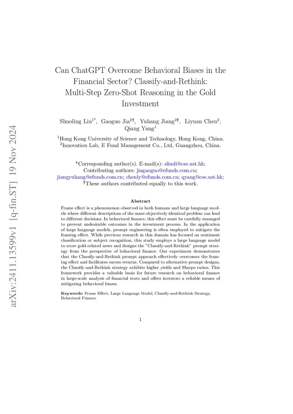 Can ChatGPT Overcome Behavioral Biases in the Financial Sector? Classify-and-Rethink: Multi-Step Zero-Shot Reasoning in the Gold Investment