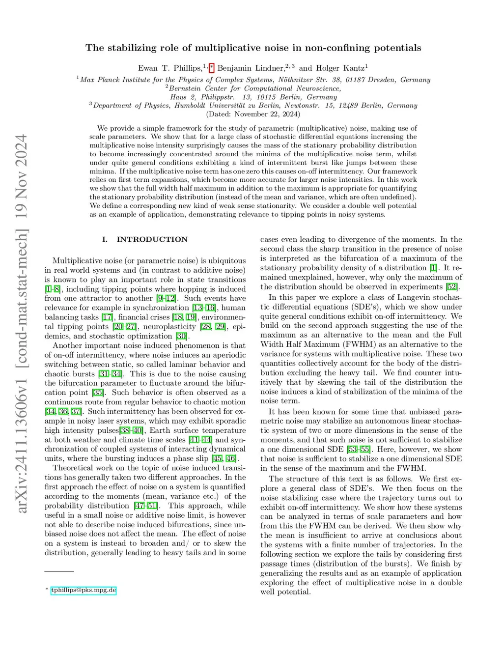 We provide a simple framework for the study of parametric (multiplicative) noise, making use of scale parameters. We show that for a large class of stochastic differential equations increasing the multiplicative noise intensity surprisingly causes the mass of the stationary probability distribution to become increasingly concentrated around the minima of the multiplicative noise term, whilst under quite general conditions exhibiting a kind of intermittent burst like jumps between these minima. If the multiplicative noise term has one zero this causes on-off intermittency. Our framework relies on first term expansions, which become more accurate for larger noise intensities. In this work we show that the full width half maximum in addition to the maximum is appropriate for quantifying the stationary probability distribution (instead of the mean and variance, which are often undefined). We define a corresponding new kind of weak sense stationarity. We consider a double well potential as an example of application, demonstrating relevance to tipping points in noisy systems.