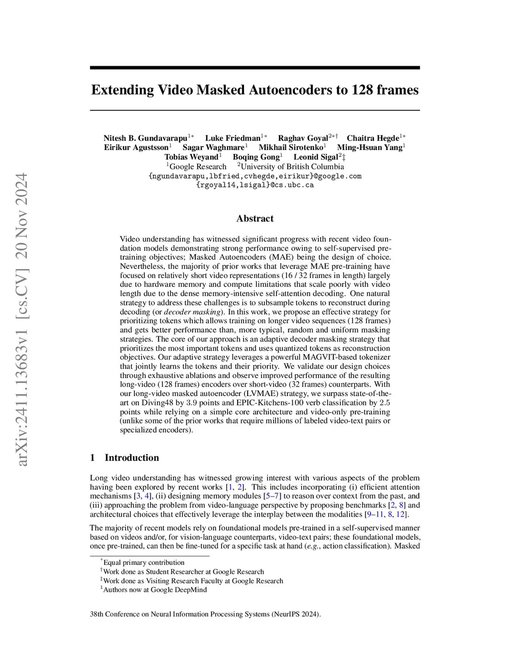 Video understanding has witnessed significant progress with recent video foundation models demonstrating strong performance owing to self-supervised pre-training objectives; Masked Autoencoders (MAE) being the design of choice. Nevertheless, the majority of prior works that leverage MAE pre-training have focused on relatively short video representations (16 / 32 frames in length) largely due to hardware memory and compute limitations that scale poorly with video length due to the dense memory-intensive self-attention decoding. One natural strategy to address these challenges is to subsample tokens to reconstruct during decoding (or decoder masking). In this work, we propose an effective strategy for prioritizing tokens which allows training on longer video sequences (128 frames) and gets better performance than, more typical, random and uniform masking strategies. The core of our approach is an adaptive decoder masking strategy that prioritizes the most important tokens and uses quantized tokens as reconstruction objectives. Our adaptive strategy leverages a powerful MAGVIT-based tokenizer that jointly learns the tokens and their priority. We validate our design choices through exhaustive ablations and observe improved performance of the resulting long-video (128 frames) encoders over short-video (32 frames) counterparts. With our long-video masked autoencoder (LVMAE) strategy, we surpass state-of-the-art on Diving48 by 3.9 points and EPIC-Kitchens-100 verb classification by 2.5 points while relying on a simple core architecture and video-only pre-training (unlike some of the prior works that require millions of labeled video-text pairs or specialized encoders).