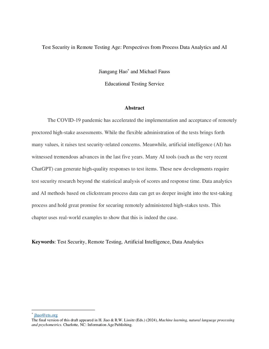 The COVID-19 pandemic has accelerated the implementation and acceptance of remotely proctored high-stake assessments. While the flexible administration of the tests brings forth many values, it raises test security-related concerns. Meanwhile, artificial intelligence (AI) has witnessed tremendous advances in the last five years. Many AI tools (such as the very recent ChatGPT) can generate high-quality responses to test items. These new developments require test security research beyond the statistical analysis of scores and response time. Data analytics and AI methods based on clickstream process data can get us deeper insight into the test-taking process and hold great promise for securing remotely administered high-stakes tests. This chapter uses real-world examples to show that this is indeed the case.