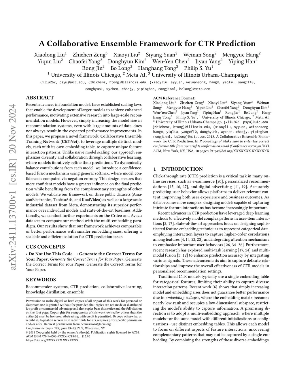 Recent advances in foundation models have established scaling laws that enable the development of larger models to achieve enhanced performance, motivating extensive research into large-scale recommendation models. However, simply increasing the model size in recommendation systems, even with large amounts of data, does not always result in the expected performance improvements. In this paper, we propose a novel framework, Collaborative Ensemble Training Network (CETNet), to leverage multiple distinct models, each with its own embedding table, to capture unique feature interaction patterns. Unlike naive model scaling, our approach emphasizes diversity and collaboration through collaborative learning, where models iteratively refine their predictions. To dynamically balance contributions from each model, we introduce a confidence-based fusion mechanism using general softmax, where model confidence is computed via negation entropy. This design ensures that more confident models have a greater influence on the final prediction while benefiting from the complementary strengths of other models. We validate our framework on three public datasets (AmazonElectronics, TaobaoAds, and KuaiVideo) as well as a large-scale industrial dataset from Meta, demonstrating its superior performance over individual models and state-of-the-art baselines. Additionally, we conduct further experiments on the Criteo and Avazu datasets to compare our method with the multi-embedding paradigm. Our results show that our framework achieves comparable or better performance with smaller embedding sizes, offering a scalable and efficient solution for CTR prediction tasks.