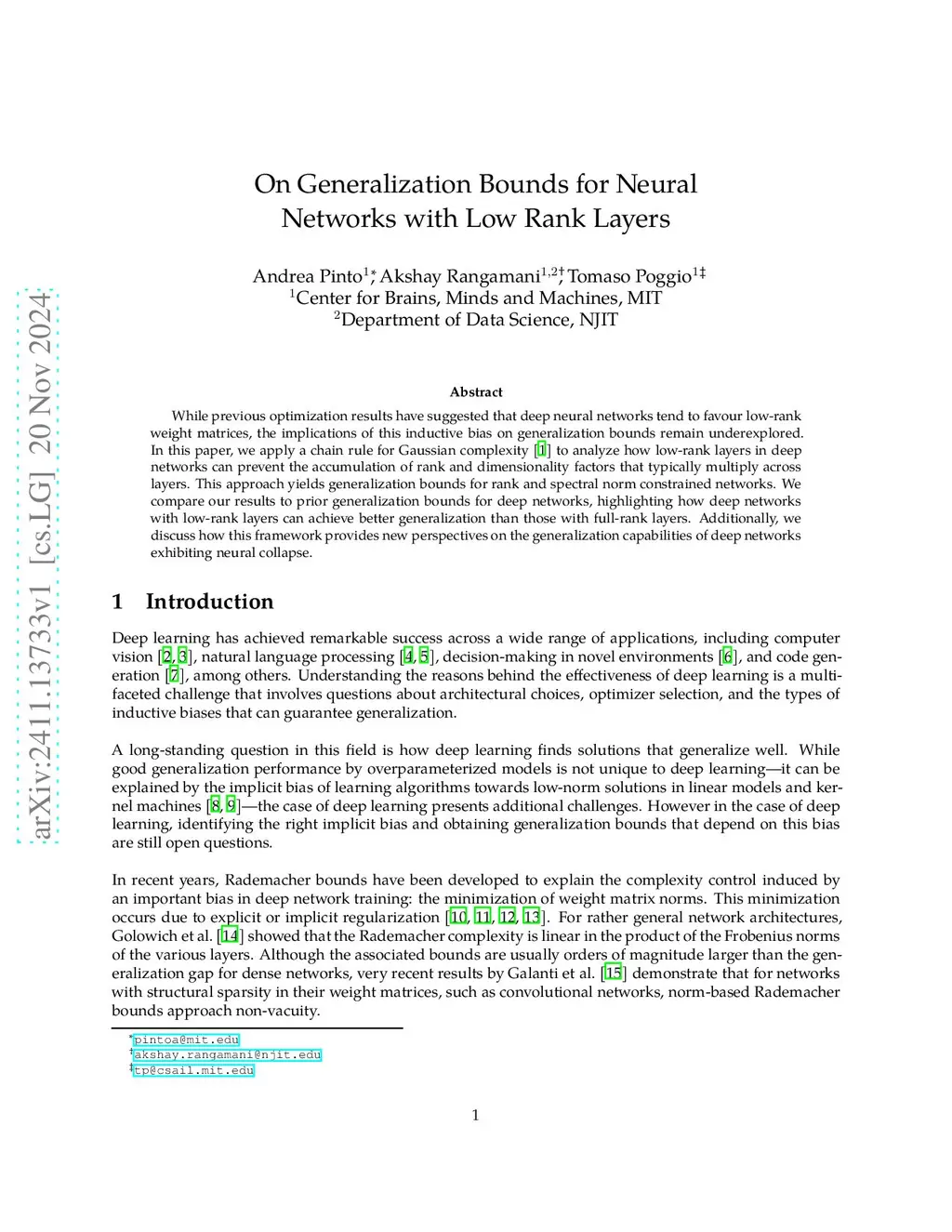 On Generalization Bounds for Neural Networks with Low Rank Layers
