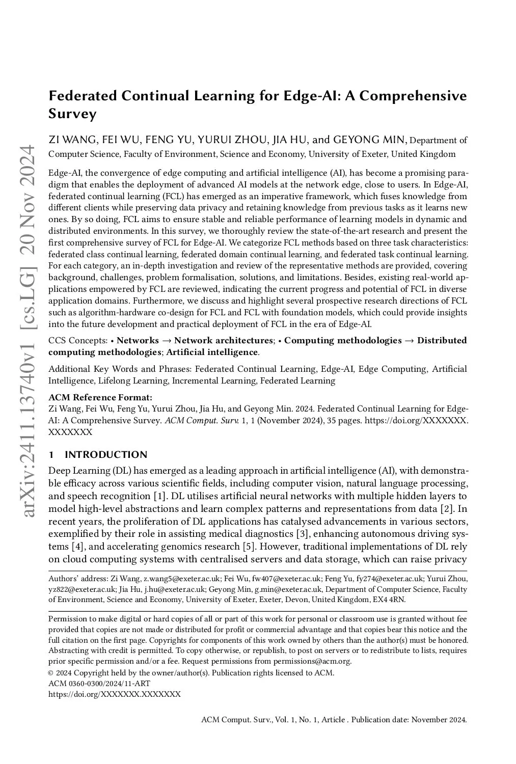 Edge-AI, the convergence of edge computing and artificial intelligence (AI), has become a promising paradigm that enables the deployment of advanced AI models at the network edge, close to users. In Edge-AI, federated continual learning (FCL) has emerged as an imperative framework, which fuses knowledge from different clients while preserving data privacy and retaining knowledge from previous tasks as it learns new ones. By so doing, FCL aims to ensure stable and reliable performance of learning models in dynamic and distributed environments. In this survey, we thoroughly review the state-of-the-art research and present the first comprehensive survey of FCL for Edge-AI. We categorize FCL methods based on three task characteristics: federated class continual learning, federated domain continual learning, and federated task continual learning. For each category, an in-depth investigation and review of the representative methods are provided, covering background, challenges, problem formalisation, solutions, and limitations. Besides, existing real-world applications empowered by FCL are reviewed, indicating the current progress and potential of FCL in diverse application domains. Furthermore, we discuss and highlight several prospective research directions of FCL such as algorithm-hardware co-design for FCL and FCL with foundation models, which could provide insights into the future development and practical deployment of FCL in the era of Edge-AI.