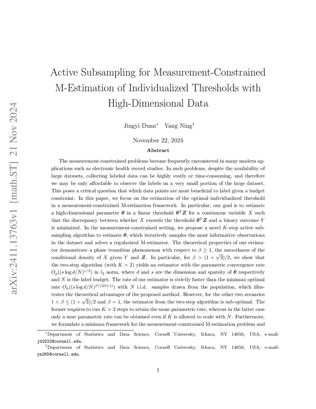 In the measurement-constrained problems, despite the availability of large datasets, we may be only affordable to observe the labels on a small portion of the large dataset. This poses a critical question that which data points are most beneficial to label given a budget constraint. In this paper, we focus on the estimation of the optimal individualized threshold in a measurement-constrained M-estimation framework. Our goal is to estimate a high-dimensional parameter in a linear threshold for a continuous variable such that the discrepancy between whether exceeds the threshold and a binary outcome is minimized. We propose a novel -step active subsampling algorithm to estimate , which iteratively samples the most informative observations and solves a regularized M-estimator. The theoretical properties of our estimator demonstrate a phase transition phenomenon with respect to , the smoothness of the conditional density of given and . For , we show that the two-step algorithm yields an estimator with the parametric convergence rate in norm. The rate of our estimator is strictly faster than the minimax optimal rate with i.i.d. samples drawn from the population. For the other two scenarios and , the estimator from the two-step algorithm is sub-optimal. The former requires to run steps to attain the same parametric rate, whereas in the latter case only a near parametric rate can be obtained. Furthermore, we formulate a minimax framework for the measurement-constrained M-estimation problem and prove that our estimator is minimax rate optimal up to a logarithmic factor. Finally, we demonstrate the performance of our method in simulation studies and apply the method to analyze a large diabetes dataset.