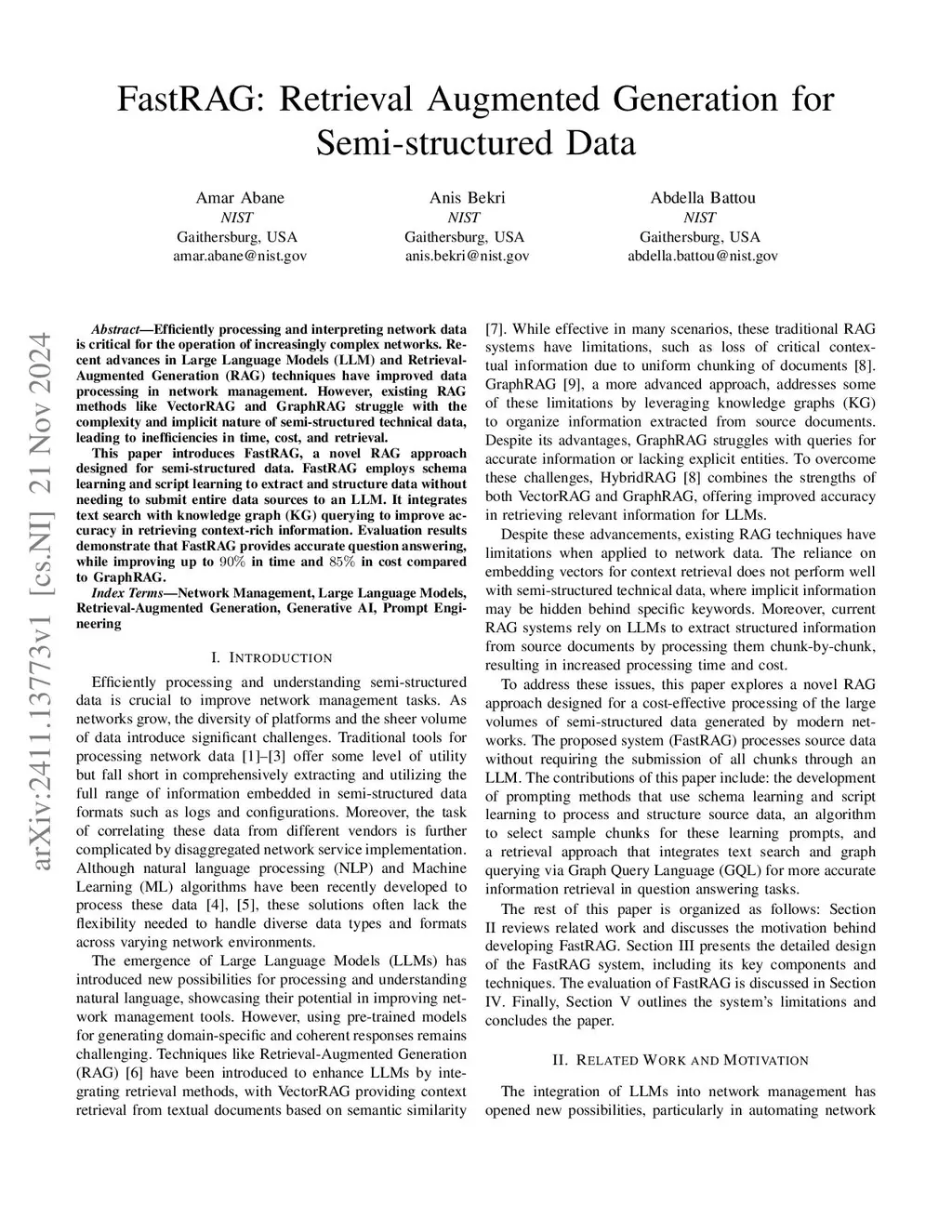 Efficiently processing and interpreting network data is critical for the operation of increasingly complex networks. Recent advances in Large Language Models (LLM) and Retrieval-Augmented Generation (RAG) techniques have improved data processing in network management. However, existing RAG methods like VectorRAG and GraphRAG struggle with the complexity and implicit nature of semi-structured technical data, leading to inefficiencies in time, cost, and retrieval. This paper introduces FastRAG, a novel RAG approach designed for semi-structured data. FastRAG employs schema learning and script learning to extract and structure data without needing to submit entire data sources to an LLM. It integrates text search with knowledge graph (KG) querying to improve accuracy in retrieving context-rich information. Evaluation results demonstrate that FastRAG provides accurate question answering, while improving up to 90% in time and 85% in cost compared to GraphRAG.