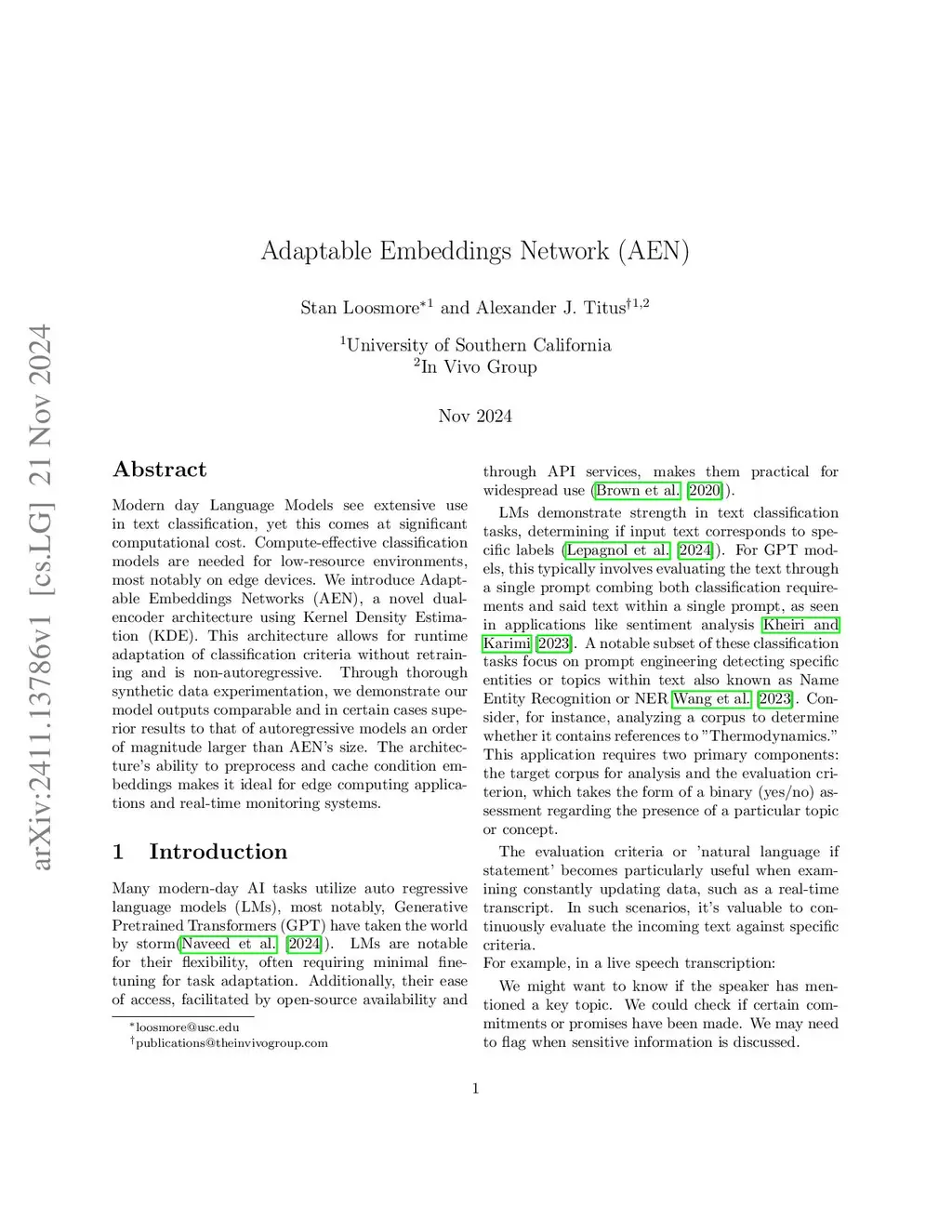 Modern day Language Models see extensive use in text classification, yet this comes at significant computational cost. Compute-effective classification models are needed for low-resource environments, most notably on edge devices. We introduce Adaptable Embeddings Networks (AEN), a novel dual-encoder architecture using Kernel Density Estimation (KDE). This architecture allows for runtime adaptation of classification criteria without retraining and is non-autoregressive. Through thorough synthetic data experimentation, we demonstrate our model outputs comparable and in certain cases superior results to that of autoregressive models an order of magnitude larger than AEN's size. The architecture's ability to preprocess and cache condition embeddings makes it ideal for edge computing applications and real-time monitoring systems.