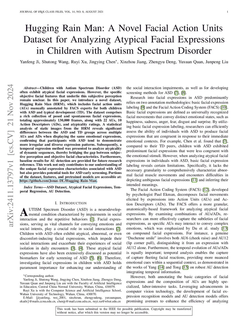 Hugging Rain Man: A Novel Facial Action Units Dataset for Analyzing