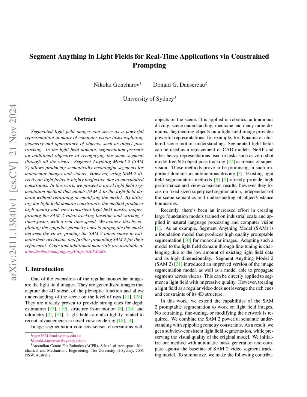 Segmented light field images can serve as a powerful representation in many of computer vision tasks exploiting geometry and appearance of objects, such as object pose tracking. In the light field domain, segmentation presents an additional objective of recognizing the same segment through all the views. Segment Anything Model 2 (SAM 2) allows producing semantically meaningful segments for monocular images and videos. However, using SAM 2 directly on light fields is highly ineffective due to unexploited constraints. In this work, we present a novel light field segmentation method that adapts SAM 2 to the light field domain without retraining or modifying the model. By utilizing the light field domain constraints, the method produces high quality and view-consistent light field masks, outperforming the SAM 2 video tracking baseline and working 7 times faster, with a real-time speed. We achieve this by exploiting the epipolar geometry cues to propagate the masks between the views, probing the SAM 2 latent space to estimate their occlusion, and further prompting SAM 2 for their refinement.