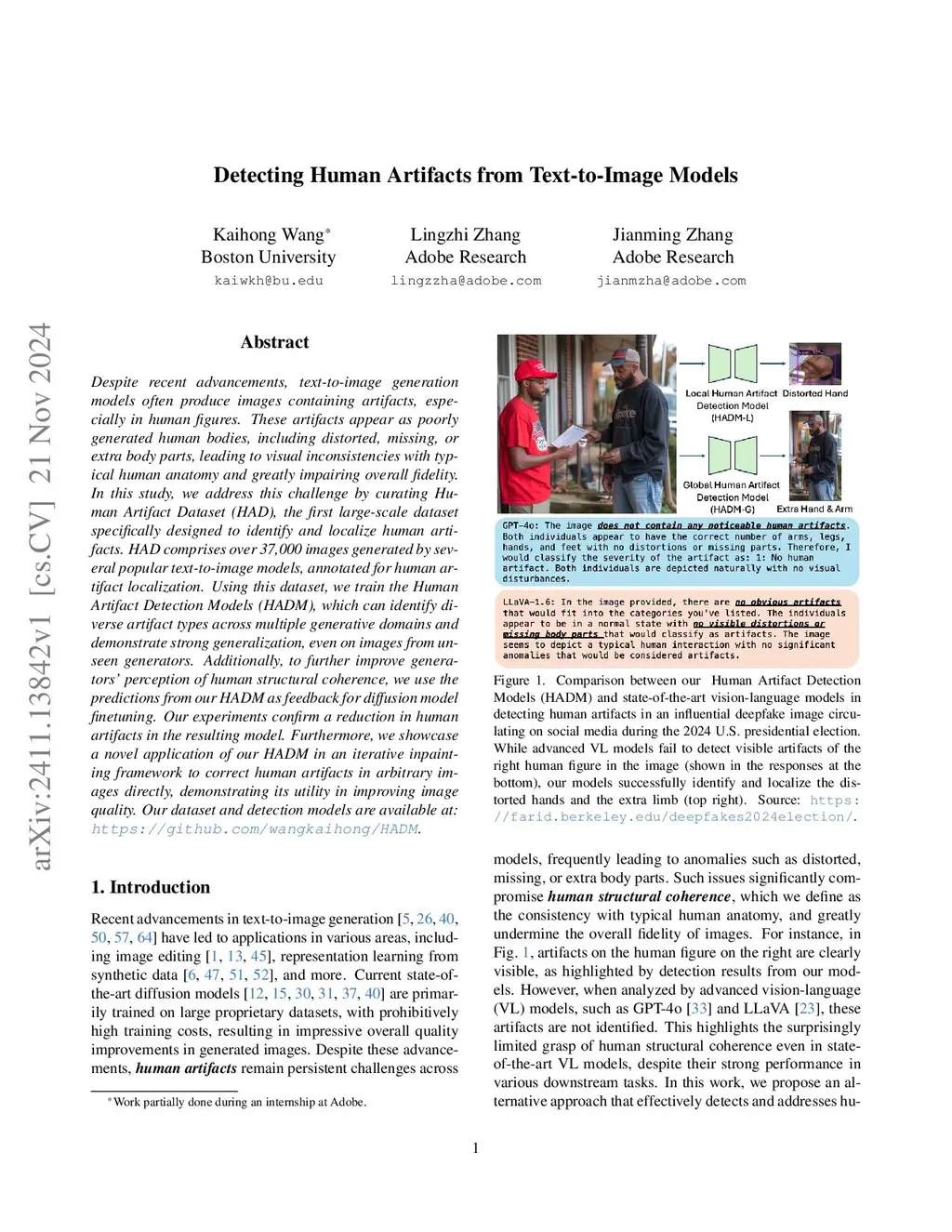 Despite recent advancements, text-to-image generation models often produce images containing artifacts, especially in human figures. These artifacts appear as poorly generated human bodies, including distorted, missing, or extra body parts, leading to visual inconsistencies with typical human anatomy and greatly impairing overall fidelity. In this study, we address this challenge by curating Human Artifact Dataset (HAD), a diverse dataset specifically designed to localize human artifacts. HAD comprises over 37,000 images generated by several popular text-to-image models, annotated for human artifact localization. Using this dataset, we train the Human Artifact Detection Models (HADM), which can identify different artifacts across multiple generative domains and demonstrate strong generalization, even on images from unseen generators. Additionally, to further improve generators' perception of human structural coherence, we use the predictions from our HADM as feedback for diffusion model finetuning. Our experiments confirm a reduction in human artifacts in the resulting model. Furthermore, we showcase a novel application of our HADM in an iterative inpainting framework to correct human artifacts in arbitrary images directly, demonstrating its utility in improving image quality. Our dataset and detection models are available at:this https URL.