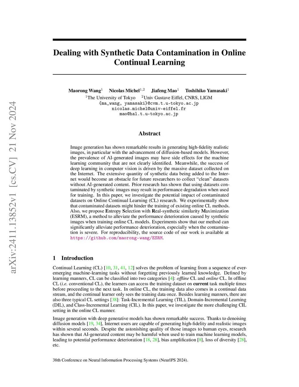 Image generation has shown remarkable results in generating high-fidelity realistic images, in particular with the advancement of diffusion-based models. However, the prevalence of AI-generated images may have side effects for the machine learning community that are not clearly identified. Meanwhile, the success of deep learning in computer vision is driven by the massive dataset collected on the Internet. The extensive quantity of synthetic data being added to the Internet would become an obstacle for future researchers to collect "clean" datasets without AI-generated content. Prior research has shown that using datasets contaminated by synthetic images may result in performance degradation when used for training. In this paper, we investigate the potential impact of contaminated datasets on Online Continual Learning (CL) research. We experimentally show that contaminated datasets might hinder the training of existing online CL methods. Also, we propose Entropy Selection with Real-synthetic similarity Maximization (ESRM), a method to alleviate the performance deterioration caused by synthetic images when training online CL models. Experiments show that our method can significantly alleviate performance deterioration, especially when the contamination is severe. For reproducibility, the source code of our work is available at https://github.com/maorong-wang/ESRM.
