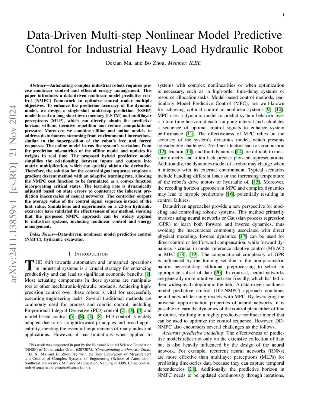 Automating complex industrial robots requires precise nonlinear control and efficient energy management. This paper introduces a data-driven nonlinear model predictive control (NMPC) framework to optimize control under multiple objectives. To enhance the prediction accuracy of the dynamic model, we design a single-shot multi-step prediction (SSMP) model based on long short-term memory (LSTM) and multilayer perceptrons (MLP), which can directly obtain the predictive horizon without iterative repetition and reduce computational pressure. Moreover, we combine offline and online models to address disturbances stemming from environmental interactions, similar to the superposition of the robot's free and forced responses. The online model learns the system's variations from the prediction mismatches of the offline model and updates its weights in real time. The proposed hybrid predictive model simplifies the relationship between inputs and outputs into matrix multiplication, which can quickly obtain the derivative. Therefore, the solution for the control signal sequence employs a gradient descent method with an adaptive learning rate, allowing the NMPC cost function to be formulated as a convex function incorporating critical states. The learning rate is dynamically adjusted based on state errors to counteract the inherent prediction inaccuracies of neural networks. The controller outputs the average value of the control signal sequence instead of the first value. Simulations and experiments on a 22-ton hydraulic excavator have validated the effectiveness of our method, showing that the proposed NMPC approach can be widely applied to industrial systems, including nonlinear control and energy management.