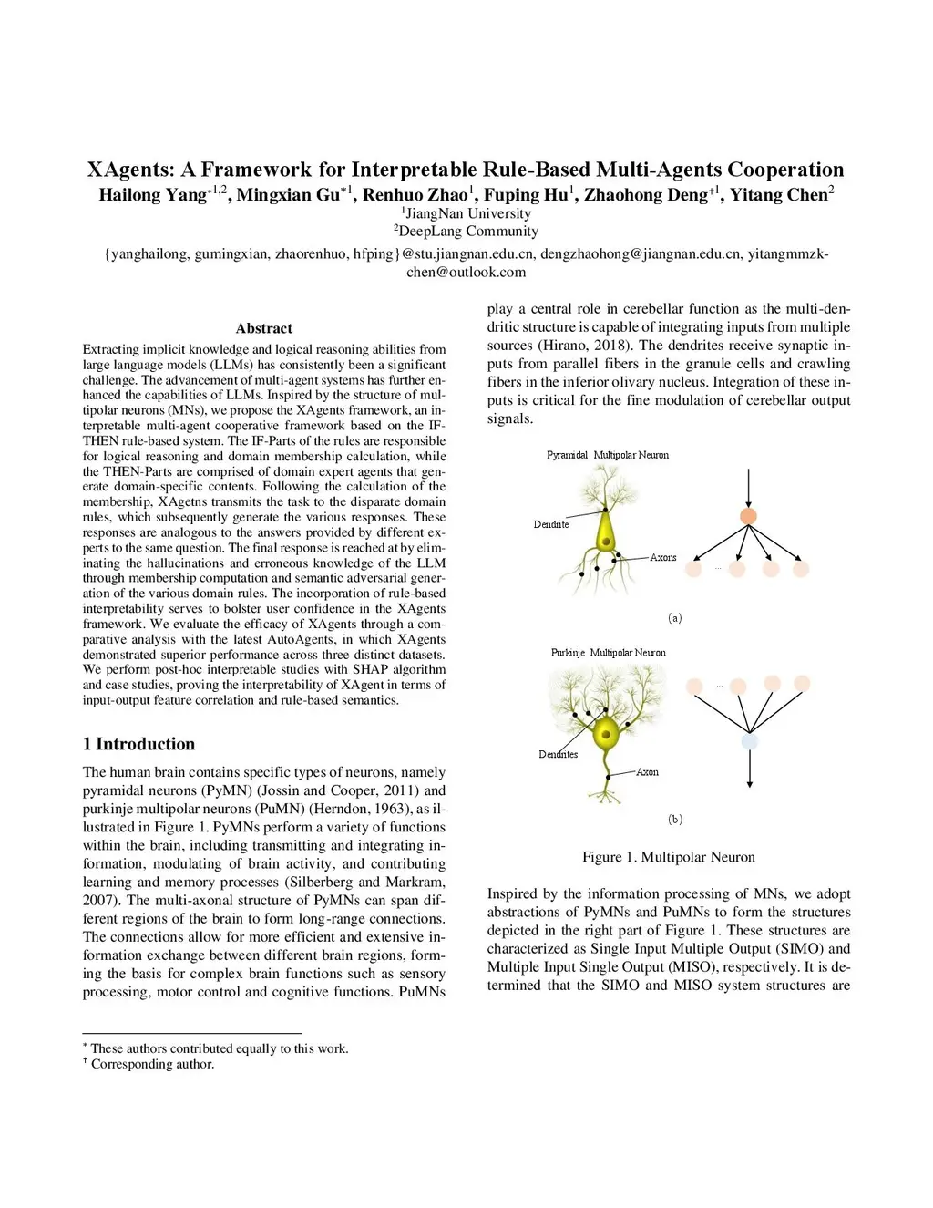 Extracting implicit knowledge and logical reasoning abilities from large language models (LLMs) has consistently been a significant challenge. The advancement of multi-agent systems has further en-hanced the capabilities of LLMs. Inspired by the structure of multi-polar neurons (MNs), we propose the XAgents framework, an in-terpretable multi-agent cooperative framework based on the IF-THEN rule-based system. The IF-Parts of the rules are responsible for logical reasoning and domain membership calculation, while the THEN-Parts are comprised of domain expert agents that generate domain-specific contents. Following the calculation of the member-ship, XAgetns transmits the task to the disparate domain rules, which subsequently generate the various responses. These re-sponses are analogous to the answers provided by different experts to the same question. The final response is reached at by eliminat-ing the hallucinations and erroneous knowledge of the LLM through membership computation and semantic adversarial genera-tion of the various domain rules. The incorporation of rule-based interpretability serves to bolster user confidence in the XAgents framework. We evaluate the efficacy of XAgents through a com-parative analysis with the latest AutoAgents, in which XAgents demonstrated superior performance across three distinct datasets. We perform post-hoc interpretable studies with SHAP algorithm and case studies, proving the interpretability of XAgent in terms of input-output feature correlation and rule-based semantics.