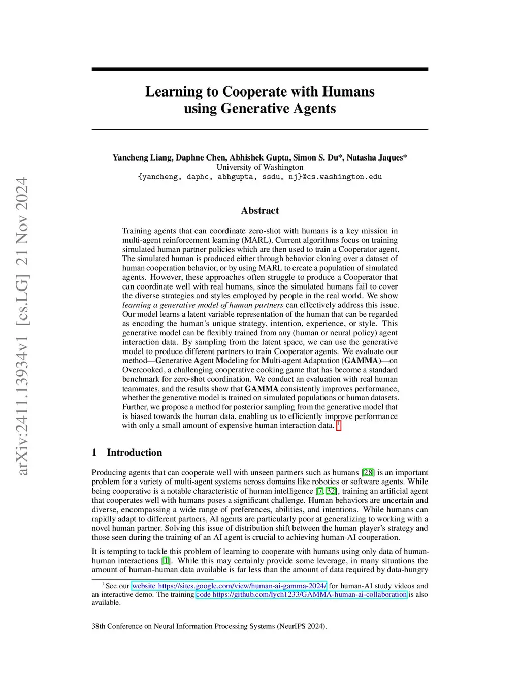 Learning to Cooperate with Humans using Generative Agents