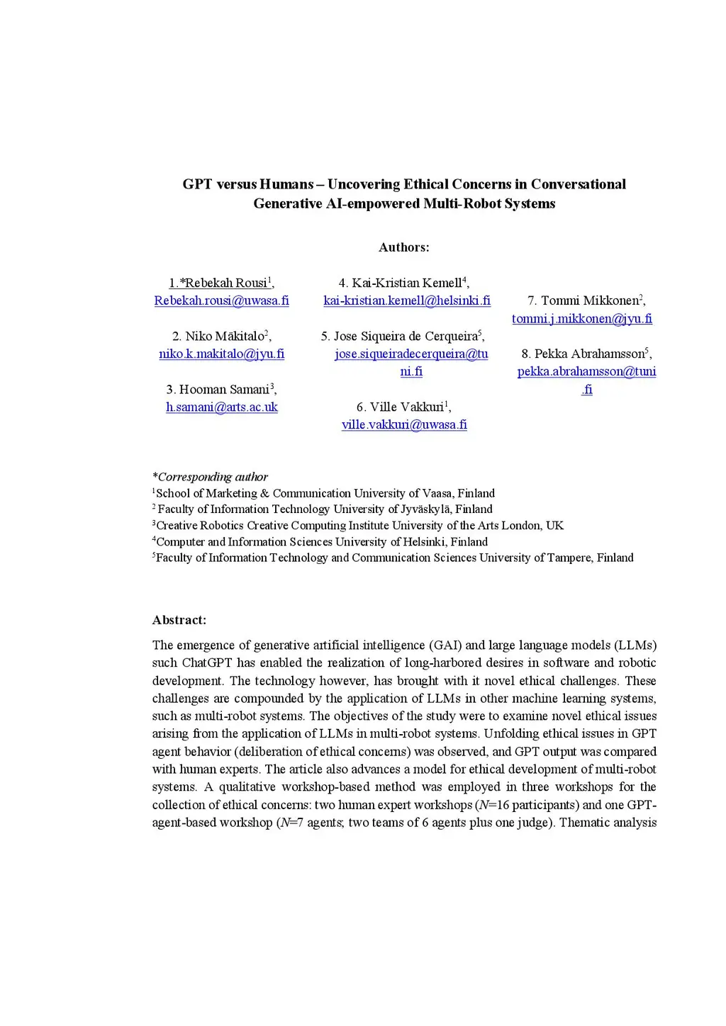 The emergence of generative artificial intelligence (GAI) and large language models (LLMs) such ChatGPT has enabled the realization of long-harbored desires in software and robotic development. The technology however, has brought with it novel ethical challenges. These challenges are compounded by the application of LLMs in other machine learning systems, such as multi-robot systems. The objectives of the study were to examine novel ethical issues arising from the application of LLMs in multi-robot systems. Unfolding ethical issues in GPT agent behavior (deliberation of ethical concerns) was observed, and GPT output was compared with human experts. The article also advances a model for ethical development of multi-robot systems. A qualitative workshop-based method was employed in three workshops for the collection of ethical concerns: two human expert workshops (N=16 participants) and one GPT-agent-based workshop (N=7 agents; two teams of 6 agents plus one judge). Thematic analysis was used to analyze the qualitative data. The results reveal differences between the human-produced and GPT-based ethical concerns. Human experts placed greater emphasis on new themes related to deviance, data privacy, bias and unethical corporate conduct. GPT agents emphasized concerns present in existing AI ethics guidelines. The study contributes to a growing body of knowledge in context-specific AI ethics and GPT application. It demonstrates the gap between human expert thinking and LLM output, while emphasizing new ethical concerns emerging in novel technology.