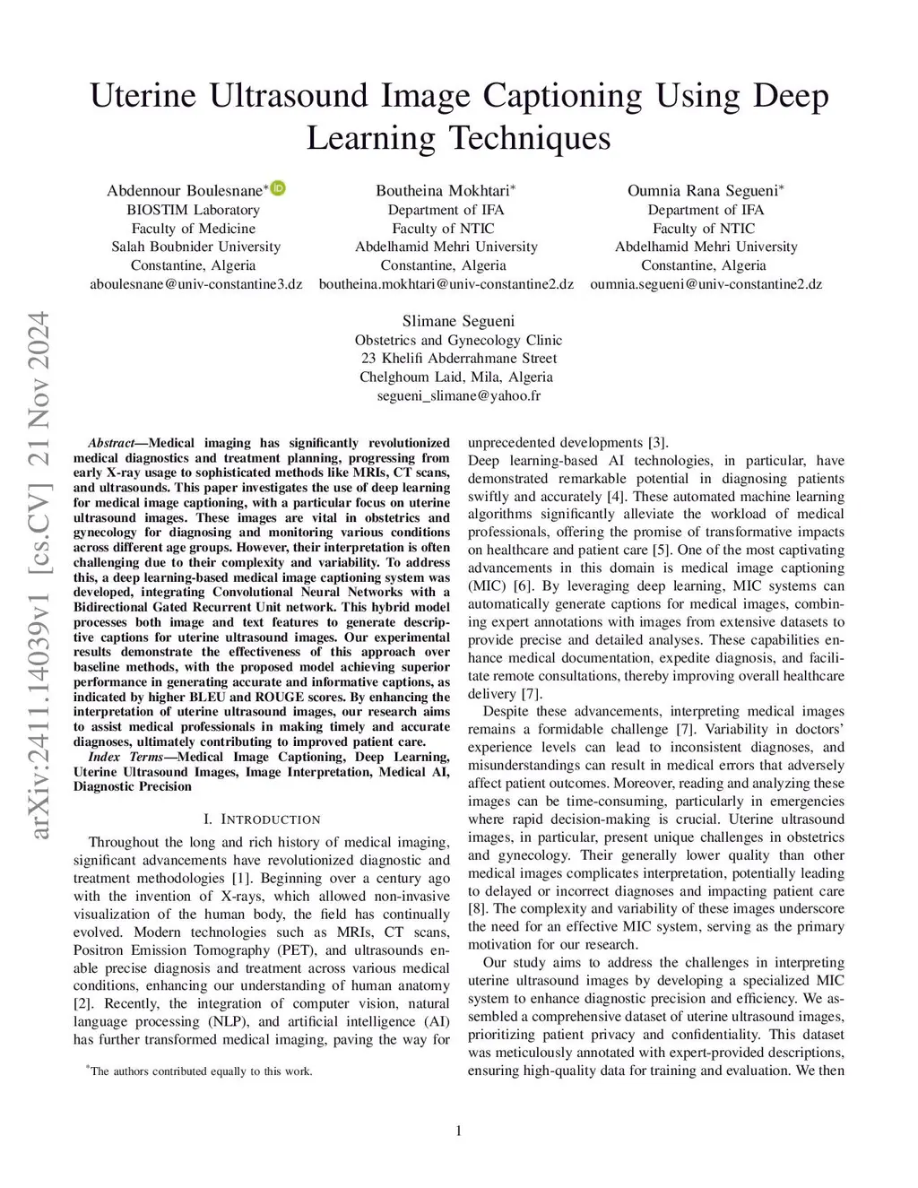 Medical imaging has significantly revolutionized medical diagnostics and treatment planning, progressing from early X-ray usage to sophisticated methods like MRIs, CT scans, and ultrasounds. This paper investigates the use of deep learning for medical image captioning, with a particular focus on uterine ultrasound images. These images are vital in obstetrics and gynecology for diagnosing and monitoring various conditions across different age groups. However, their interpretation is often challenging due to their complexity and variability. To address this, a deep learning-based medical image captioning system was developed, integrating Convolutional Neural Networks with a Bidirectional Gated Recurrent Unit network. This hybrid model processes both image and text features to generate descriptive captions for uterine ultrasound images. Our experimental results demonstrate the effectiveness of this approach over baseline methods, with the proposed model achieving superior performance in generating accurate and informative captions, as indicated by higher BLEU and ROUGE scores. By enhancing the interpretation of uterine ultrasound images, our research aims to assist medical professionals in making timely and accurate diagnoses, ultimately contributing to improved patient care.