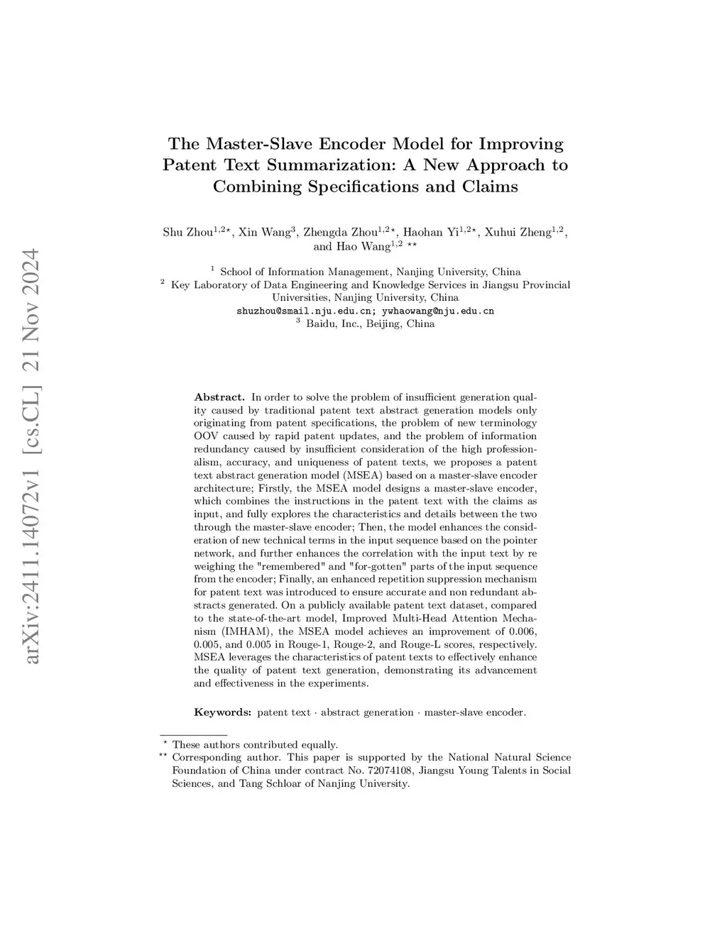 The Master-Slave Encoder Model for Improving Patent Text Summarization: