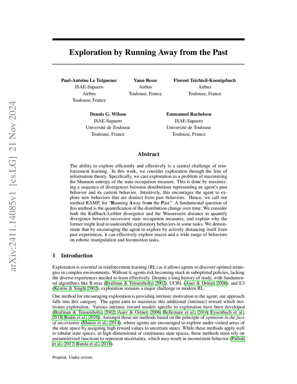 The ability to explore efficiently and effectively is a central challenge of reinforcement learning. In this work, we consider exploration through the lens of information theory. Specifically, we cast exploration as a problem of maximizing the Shannon entropy of the state occupation measure. This is done by maximizing a sequence of divergences between distributions representing an agent's past behavior and its current behavior. Intuitively, this encourages the agent to explore new behaviors that are distinct from past behaviors. Hence, we call our method RAMP, for ``unning way fro the ast.'' A fundamental question of this method is the quantification of the distribution change over time. We consider both the Kullback-Leibler divergence and the Wasserstein distance to quantify divergence between successive state occupation measures, and explain why the former might lead to undesirable exploratory behaviors in some tasks. We demonstrate that by encouraging the agent to explore by actively distancing itself from past experiences, it can effectively explore mazes and a wide range of behaviors on robotic manipulation and locomotion tasks.