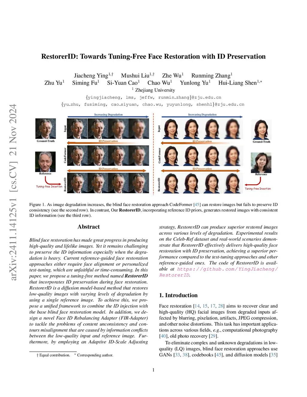 Blind face restoration has made great progress in producing high-quality and lifelike images. Yet it remains challenging to preserve the ID information especially when the degradation is heavy. Current reference-guided face restoration approaches either require face alignment or personalized test-tuning, which are unfaithful or time-consuming. In this paper, we propose a tuning-free method named RestorerID that incorporates ID preservation during face restoration. RestorerID is a diffusion model-based method that restores low-quality images with varying levels of degradation by using a single reference image. To achieve this, we propose a unified framework to combine the ID injection with the base blind face restoration model. In addition, we design a novel Face ID Rebalancing Adapter (FIR-Adapter) to tackle the problems of content unconsistency and contours misalignment that are caused by information conflicts between the low-quality input and reference image. Furthermore, by employing an Adaptive ID-Scale Adjusting strategy, RestorerID can produce superior restored images across various levels of degradation. Experimental results on the Celeb-Ref dataset and real-world scenarios demonstrate that RestorerID effectively delivers high-quality face restoration with ID preservation, achieving a superior performance compared to the test-tuning approaches and other reference-guided ones. The code of RestorerID is available at \url{https://github.com/YingJiacheng/RestorerID}.