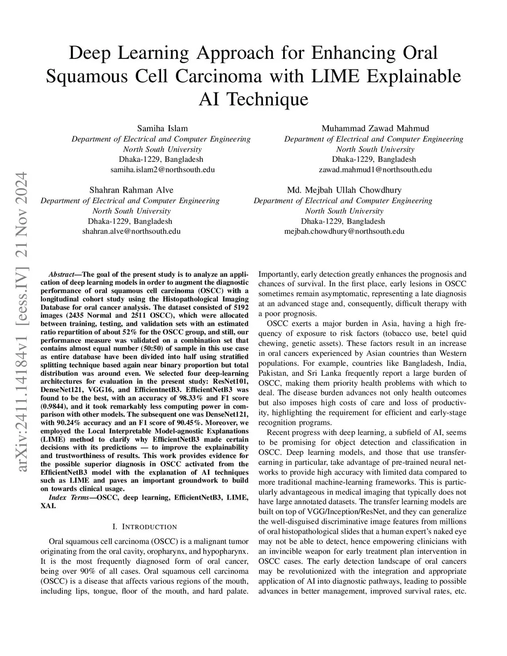 The goal of the present study is to analyze an application of deep learning models in order to augment the diagnostic performance of oral squamous cell carcinoma (OSCC) with a longitudinal cohort study using the Histopathological Imaging Database for oral cancer analysis. The dataset consisted of 5192 images (2435 Normal and 2511 OSCC), which were allocated between training, testing, and validation sets with an estimated ratio repartition of about 52% for the OSCC group, and still, our performance measure was validated on a combination set that contains almost equal number of sample in this use case as entire database have been divided into half using stratified splitting technique based again near binary proportion but total distribution was around even. We selected four deep-learning architectures for evaluation in the present study: ResNet101, DenseNet121, VGG16, and EfficientnetB3. EfficientNetB3 was found to be the best, with an accuracy of 98.33% and F1 score (0.9844), and it took remarkably less computing power in comparison with other models. The subsequent one was DenseNet121, with 90.24% accuracy and an F1 score of 90.45%. Moreover, we employed the Local Interpretable Model-agnostic Explanations (LIME) method to clarify why EfficientNetB3 made certain decisions with its predictions to improve the explainability and trustworthiness of results. This work provides evidence for the possible superior diagnosis in OSCC activated from the EfficientNetB3 model with the explanation of AI techniques such as LIME and paves an important groundwork to build on towards clinical usage.