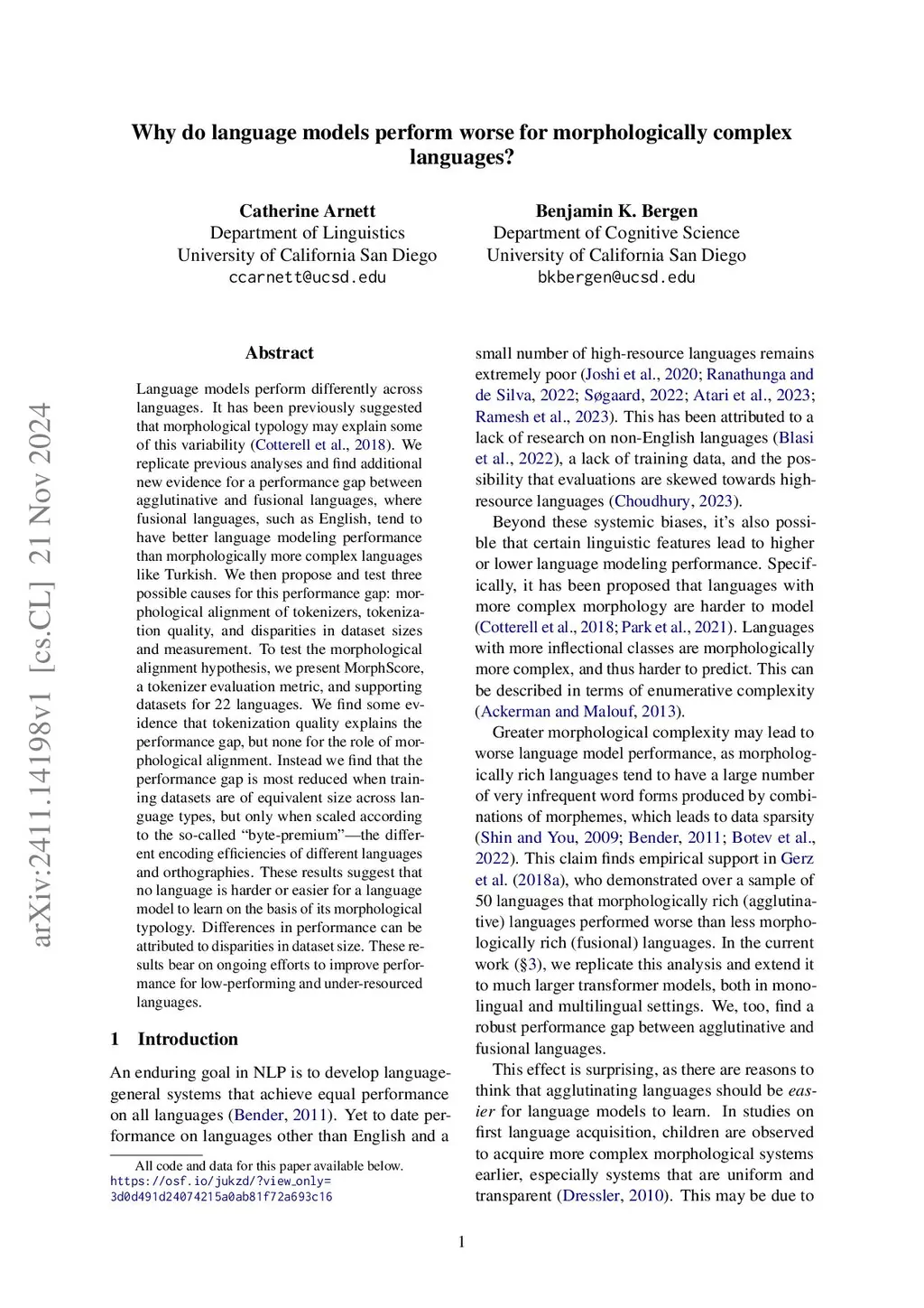 Language models perform differently across languages. It has been previously suggested that morphological typology may explain some of this variability (Cotterell et al., 2018). We replicate previous analyses and find additional new evidence for a performance gap between agglutinative and fusional languages, where fusional languages, such as English, tend to have better language modeling performance than morphologically more complex languages like Turkish. We then propose and test three possible causes for this performance gap: morphological alignment of tokenizers, tokenization quality, and disparities in dataset sizes and measurement. To test the morphological alignment hypothesis, we present MorphScore, a tokenizer evaluation metric, and supporting datasets for 22 languages. We find some evidence that tokenization quality explains the performance gap, but none for the role of morphological alignment. Instead we find that the performance gap is most reduced when training datasets are of equivalent size across language types, but only when scaled according to the so-called "byte-premium" -- the different encoding efficiencies of different languages and orthographies. These results suggest that no language is harder or easier for a language model to learn on the basis of its morphological typology. Differences in performance can be attributed to disparities in dataset size. These results bear on ongoing efforts to improve performance for low-performing and under-resourced languages.