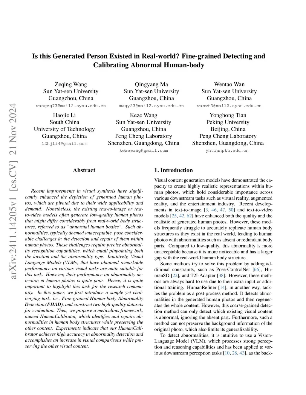 Recent improvements in visual synthesis have significantly enhanced the depiction of generated human photos, which are pivotal due to their wide applicability and demand. Nonetheless, the existing text-to-image or text-to-video models often generate low-quality human photos that might differ considerably from real-world body structures, referred to as "abnormal human bodies". Such abnormalities, typically deemed unacceptable, pose considerable challenges in the detection and repair of them within human photos. These challenges require precise abnormality recognition capabilities, which entail pinpointing both the location and the abnormality type. Intuitively, Visual Language Models (VLMs) that have obtained remarkable performance on various visual tasks are quite suitable for this task. However, their performance on abnormality detection in human photos is quite poor. Hence, it is quite important to highlight this task for the research community. In this paper, we first introduce a simple yet challenging task, i.e., \textbf{F}ine-grained \textbf{H}uman-body \textbf{A}bnormality \textbf{D}etection \textbf{(FHAD)}, and construct two high-quality datasets for evaluation. Then, we propose a meticulous framework, named HumanCalibrator, which identifies and repairs abnormalities in human body structures while preserving the other content. Experiments indicate that our HumanCalibrator achieves high accuracy in abnormality detection and accomplishes an increase in visual comparisons while preserving the other visual content.