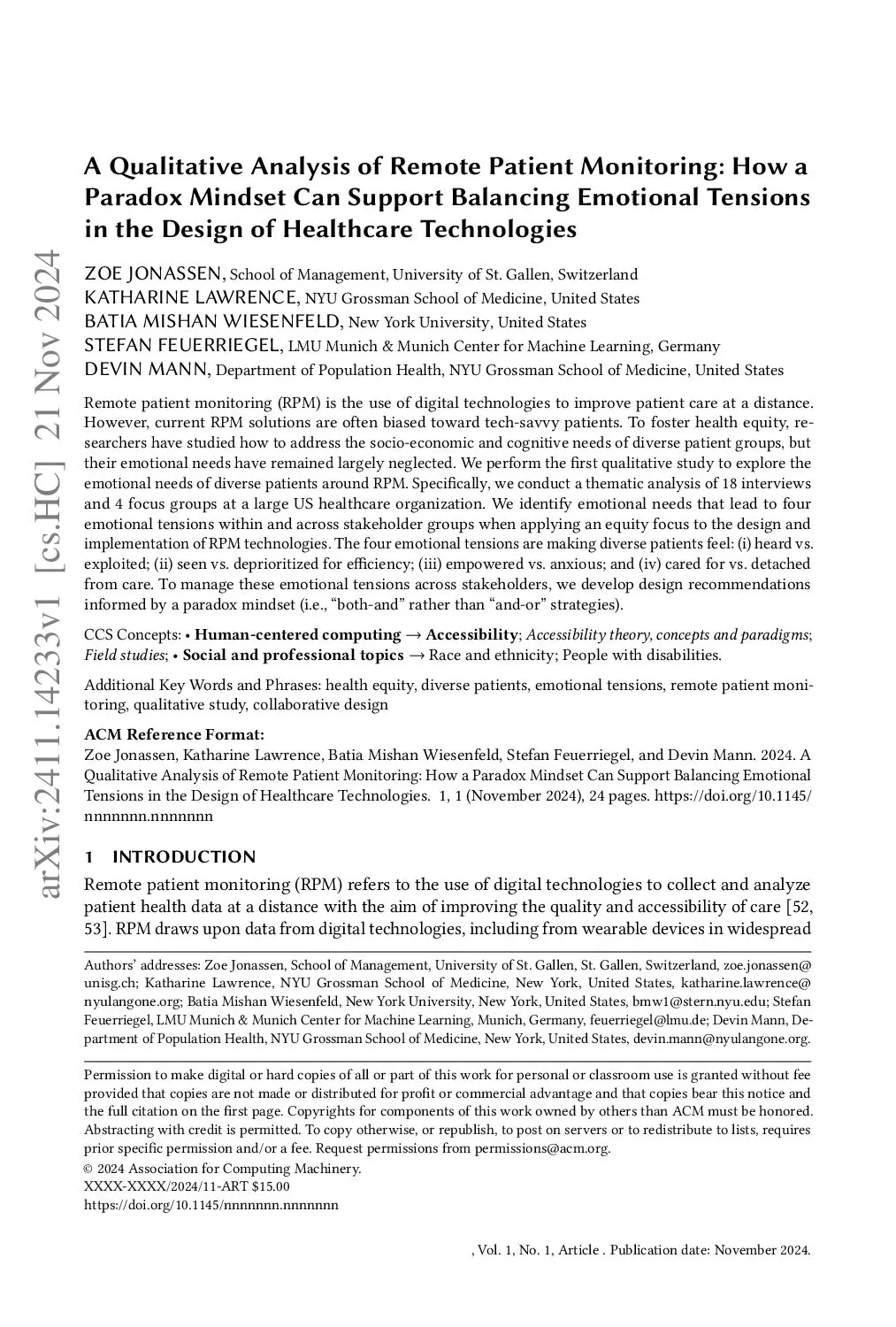 Remote patient monitoring (RPM) is the use of digital technologies to improve patient care at a distance. However, current RPM solutions are often biased toward tech-savvy patients. To foster health equity, researchers have studied how to address the socio-economic and cognitive needs of diverse patient groups, but their emotional needs have remained largely neglected. We perform the first qualitative study to explore the emotional needs of diverse patients around RPM. Specifically, we conduct a thematic analysis of 18 interviews and 4 focus groups at a large US healthcare organization. We identify emotional needs that lead to four emotional tensions within and across stakeholder groups when applying an equity focus to the design and implementation of RPM technologies. The four emotional tensions are making diverse patients feel: (i) heard vs. exploited; (ii) seen vs. deprioritized for efficiency; (iii) empowered vs. anxious; and (iv) cared for vs. detached from care. To manage these emotional tensions across stakeholders, we develop design recommendations informed by a paradox mindset (i.e., "both-and" rather than "and-or" strategies).