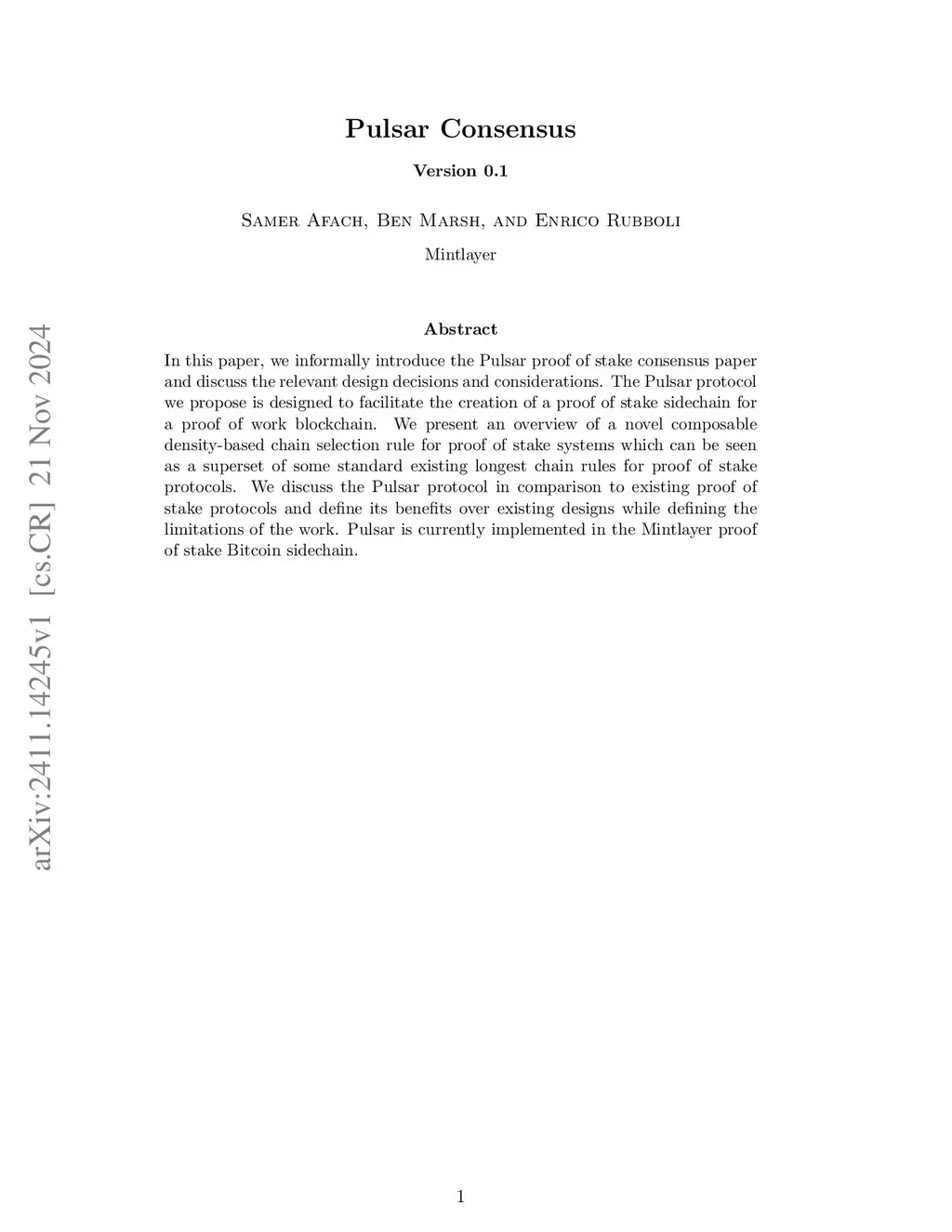 In this paper, we informally introduce the Pulsar proof of stake consensus paper and discuss the relevant design decisions and considerations. The Pulsar protocol we propose is designed to facilitate the creation of a proof of stake sidechain for a proof of work blockchain. We present an overview of a novel composable density-based chain selection rule for proof of stake systems which can be seen as a superset of some standard existing longest chain rules for proof of stake protocols. We discuss the Pulsar protocol in comparison to existing proof of stake protocols and define its benefits over existing designs while defining the limitations of the work. Pulsar is currently implemented in the Mintlayer proof of stake Bitcoin sidechain.