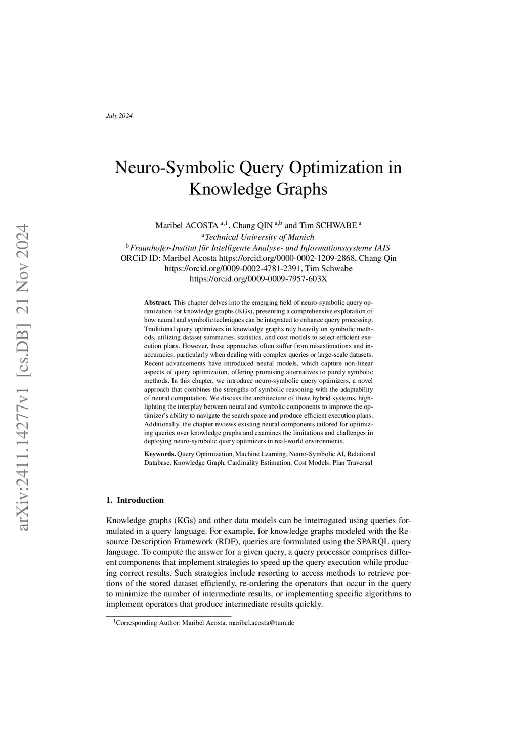 This chapter delves into the emerging field of neuro-symbolic query optimization for knowledge graphs (KGs), presenting a comprehensive exploration of how neural and symbolic techniques can be integrated to enhance query processing. Traditional query optimizers in knowledge graphs rely heavily on symbolic methods, utilizing dataset summaries, statistics, and cost models to select efficient execution plans. However, these approaches often suffer from misestimations and inaccuracies, particularly when dealing with complex queries or large-scale datasets. Recent advancements have introduced neural models, which capture non-linear aspects of query optimization, offering promising alternatives to purely symbolic methods. In this chapter, we introduce neuro-symbolic query optimizers, a novel approach that combines the strengths of symbolic reasoning with the adaptability of neural computation. We discuss the architecture of these hybrid systems, highlighting the interplay between neural and symbolic components to improve the optimizer's ability to navigate the search space and produce efficient execution plans. Additionally, the chapter reviews existing neural components tailored for optimizing queries over knowledge graphs and examines the limitations and challenges in deploying neuro-symbolic query optimizers in real-world environments.
