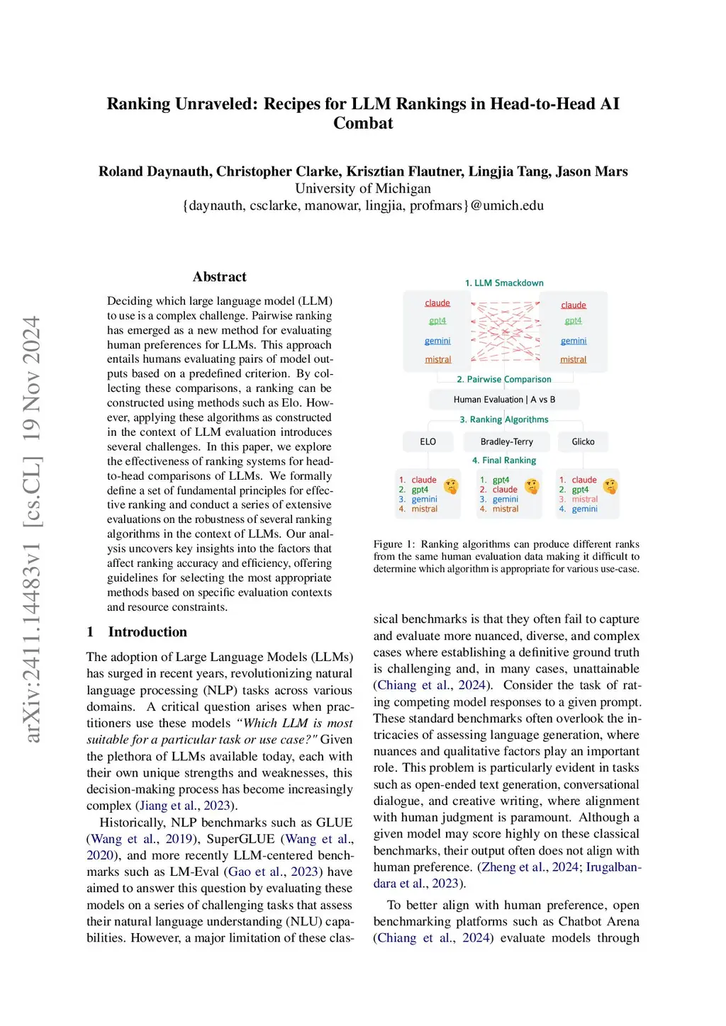 Deciding which large language model (LLM) to use is a complex challenge. Pairwise ranking has emerged as a new method for evaluating human preferences for LLMs. This approach entails humans evaluating pairs of model outputs based on a predefined criterion. By collecting these comparisons, a ranking can be constructed using methods such as Elo. However, applying these algorithms as constructed in the context of LLM evaluation introduces several challenges. In this paper, we explore the effectiveness of ranking systems for head-to-head comparisons of LLMs. We formally define a set of fundamental principles for effective ranking and conduct a series of extensive evaluations on the robustness of several ranking algorithms in the context of LLMs. Our analysis uncovers key insights into the factors that affect ranking accuracy and efficiency, offering guidelines for selecting the most appropriate methods based on specific evaluation contexts and resource constraints.