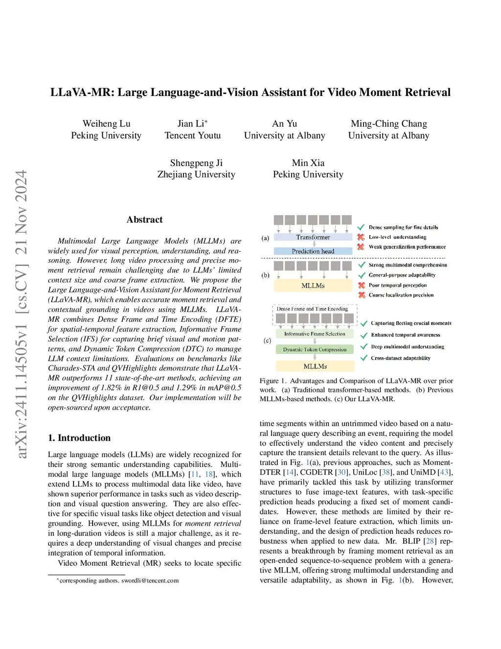 Multimodal Large Language Models (MLLMs) are widely used for visual perception, understanding, and reasoning. However, long video processing and precise moment retrieval remain challenging due to LLMs' limited context size and coarse frame extraction. We propose the Large Language-and-Vision Assistant for Moment Retrieval (LLaVA-MR), which enables accurate moment retrieval and contextual grounding in videos using MLLMs. LLaVA-MR combines Dense Frame and Time Encoding (DFTE) for spatial-temporal feature extraction, Informative Frame Selection (IFS) for capturing brief visual and motion patterns, and Dynamic Token Compression (DTC) to manage LLM context limitations. Evaluations on benchmarks like Charades-STA and QVHighlights demonstrate that LLaVA-MR outperforms 11 state-of-the-art methods, achieving an improvement of 1.82% in R1@0.5 and 1.29% in mAP@0.5 on the QVHighlights dataset. Our implementation will be open-sourced upon acceptance.
