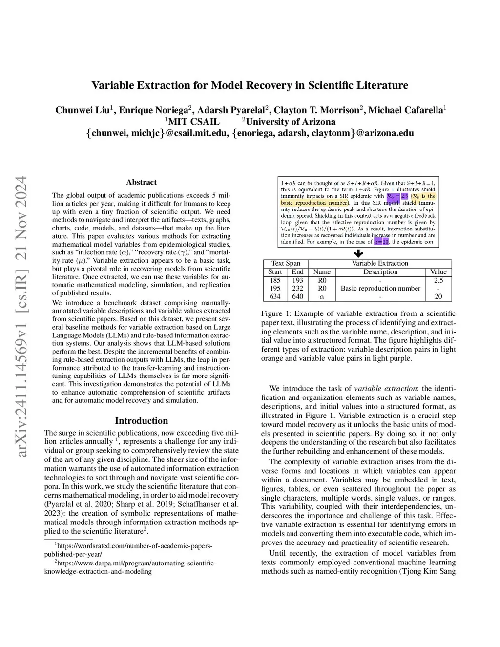 The global output of academic publications exceeds 5 million articles per year, making it difficult for humans to keep up with even a tiny fraction of scientific output. We need methods to navigate and interpret the artifacts -- texts, graphs, charts, code, models, and datasets -- that make up the literature. This paper evaluates various methods for extracting mathematical model variables from epidemiological studies, such as ``infection rate (),'' ``recovery rate (),'' and ``mortality rate ().'' Variable extraction appears to be a basic task, but plays a pivotal role in recovering models from scientific literature. Once extracted, we can use these variables for automatic mathematical modeling, simulation, and replication of published results. We introduce a benchmark dataset comprising manually-annotated variable descriptions and variable values extracted from scientific papers. Based on this dataset, we present several baseline methods for variable extraction based on Large Language Models (LLMs) and rule-based information extraction systems. Our analysis shows that LLM-based solutions perform the best. Despite the incremental benefits of combining rule-based extraction outputs with LLMs, the leap in performance attributed to the transfer-learning and instruction-tuning capabilities of LLMs themselves is far more significant. This investigation demonstrates the potential of LLMs to enhance automatic comprehension of scientific artifacts and for automatic model recovery and simulation.
