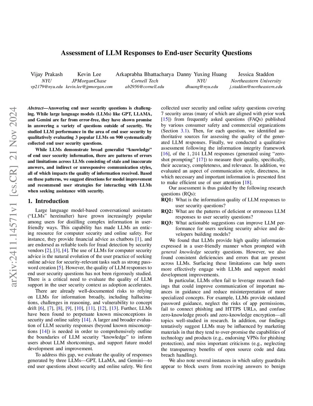 Answering end user security questions is challenging. While large language models (LLMs) like GPT, LLAMA, and Gemini are far from error-free, they have shown promise in answering a variety of questions outside of security. We studied LLM performance in the area of end user security by qualitatively evaluating 3 popular LLMs on 900 systematically collected end user security questions.While LLMs demonstrate broad generalist ``knowledge'' of end user security information, there are patterns of errors and limitations across LLMs consisting of stale and inaccurate answers, and indirect or unresponsive communication styles, all of which impacts the quality of information received. Based on these patterns, we suggest directions for model improvement and recommend user strategies for interacting with LLMs when seeking assistance with security.